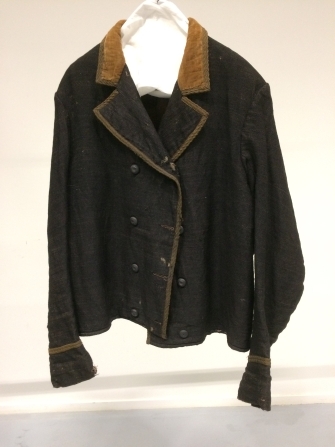 Twee-rijig jasje van zwart-bruin wollen vijfschaft met reverskraag, okergeel fluwelen kraag, afgezet met bruin wollen band