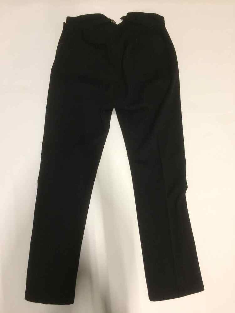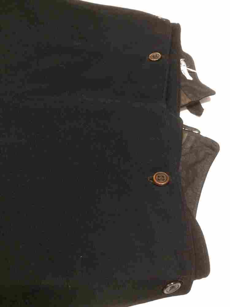 Slanke zwarte wollen broek met klepsluiting en benen knopen, met zakken van beige katoen-satijn