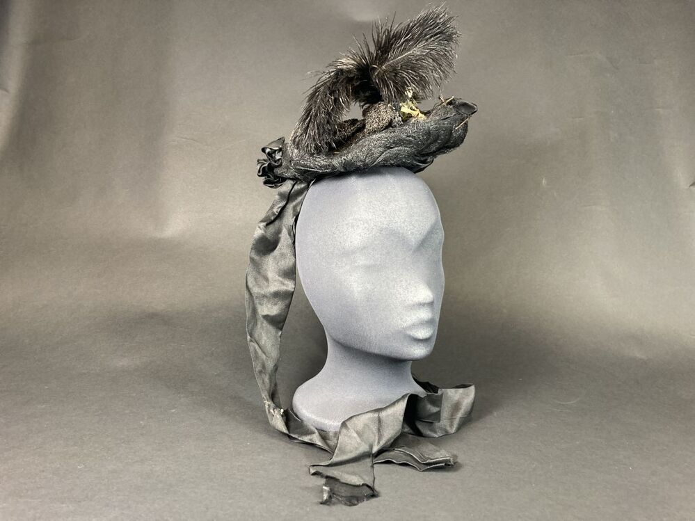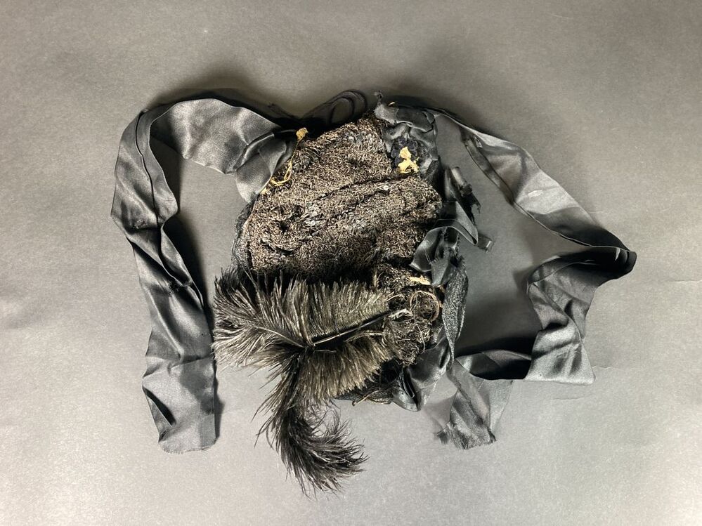 Zwarte kypske of kapothoed met gevlochten banden, kunstzijden draperie en twee korte 'struisveertjes'
