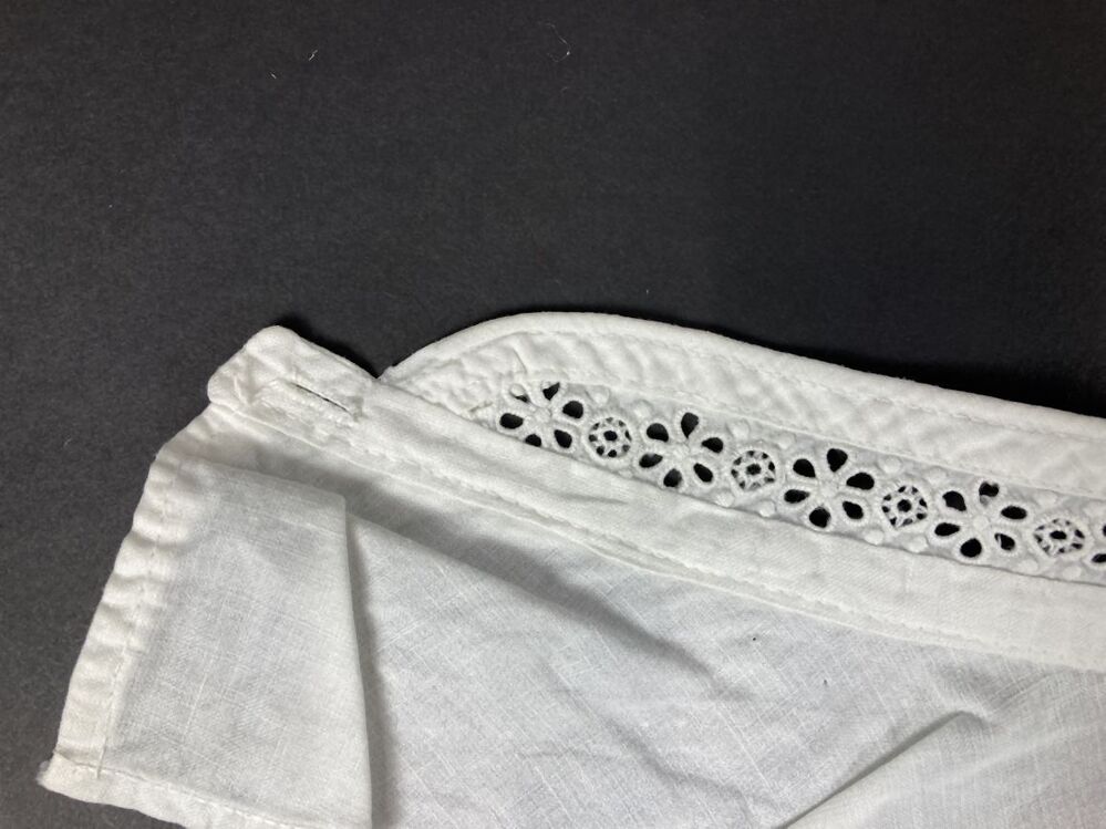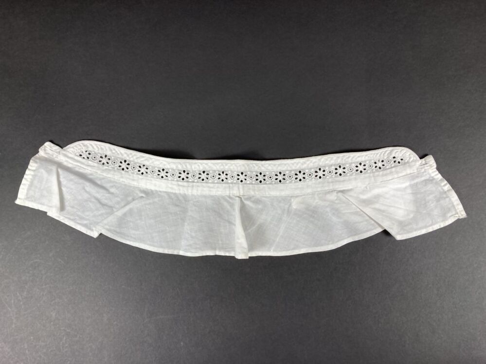 Kraag van wit katoen met opstaand boordje van broderie afgewerkt met rolnaad, onderdeel van groep van drie