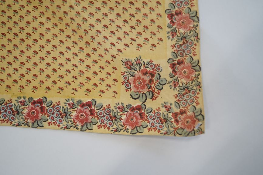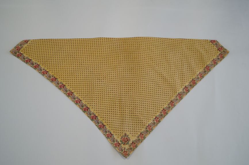 'Vijfhoekige' tipdoek gemaakt van vierkante doek van bedrukt geel katoen, gestileerd rood-groen strooimotief en bloemenrand
