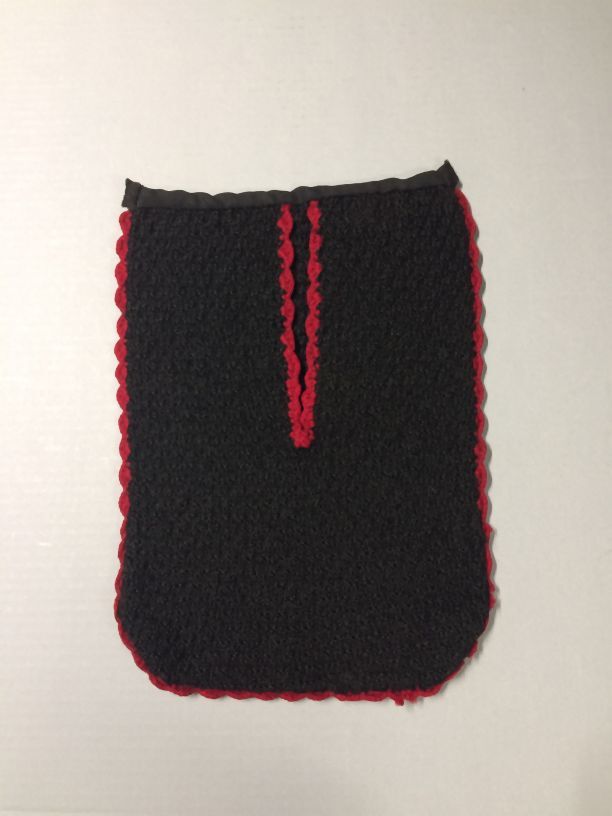 Gebreide voorspanzak van zwarte wol, rondom afgewerkt met gehaakte donkerrode schulpen, zonder banden, onderdeel van groep van twee