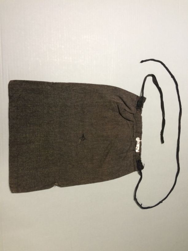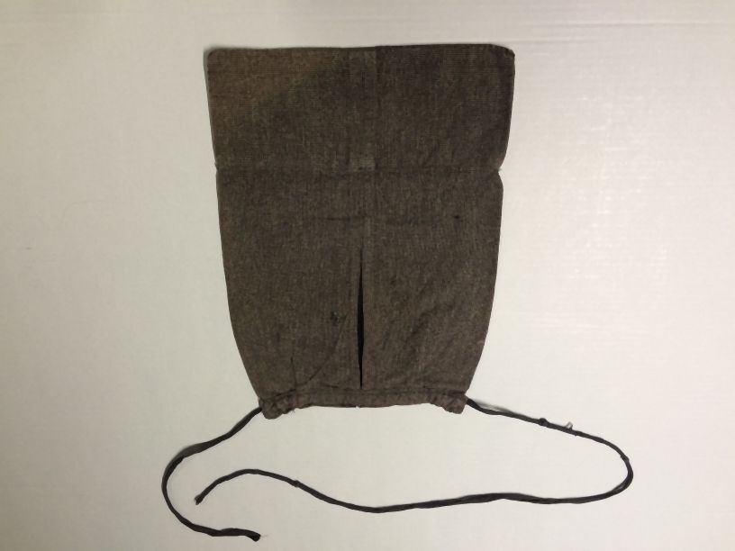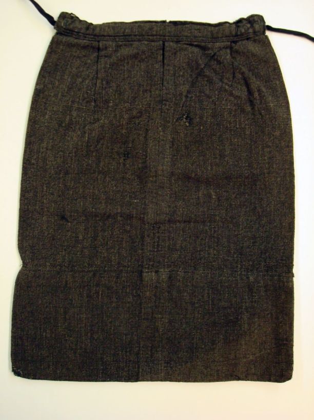 Voorspanzak genaaid van wollen stof, zwart met wit spikkeltje, de onderkant is een dubbele laag, onderdeel van groep van twee