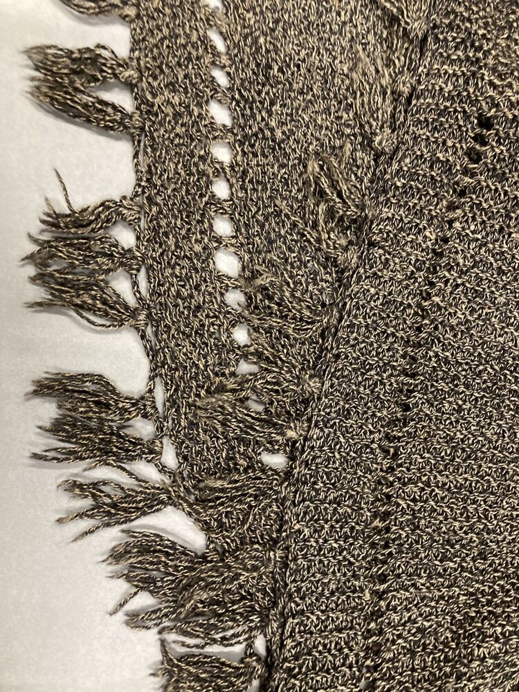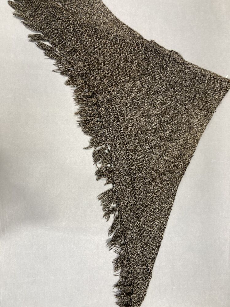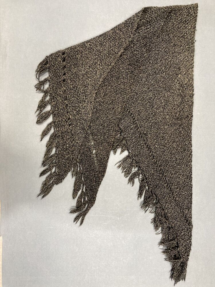 Driekante omslagdoek met , in ribbels gebreid van gemêleerde zwart-beige garen