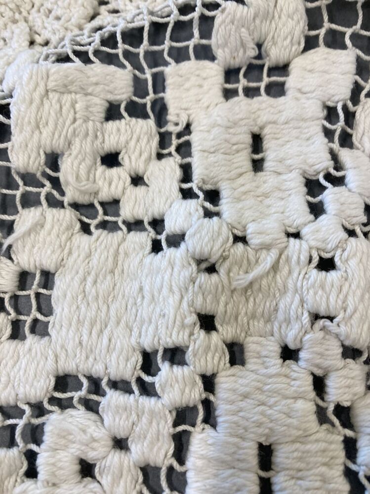 Muts met bol van filetknoopwerk met gehaakte hanekam
