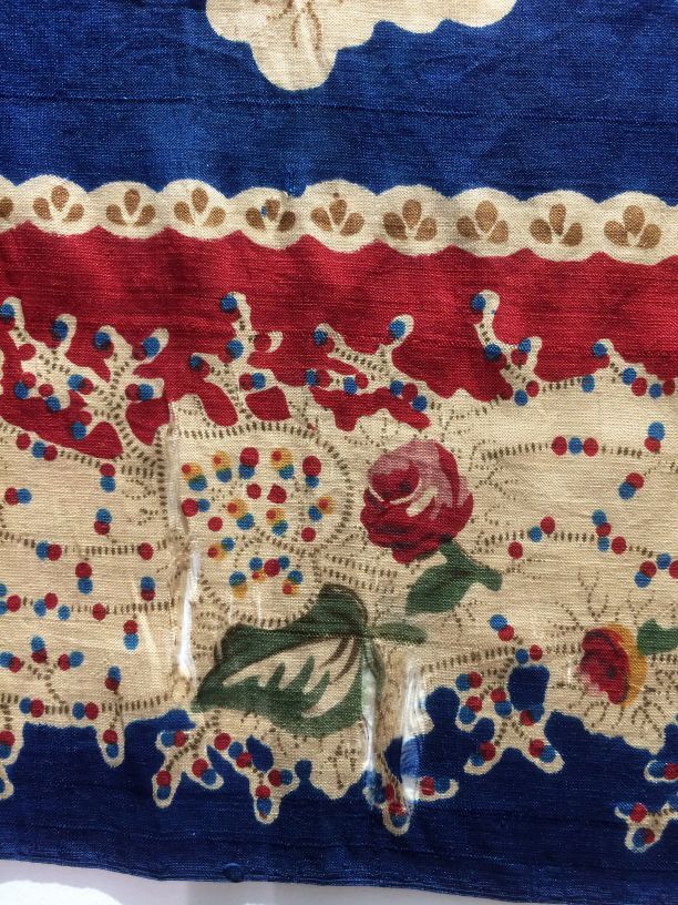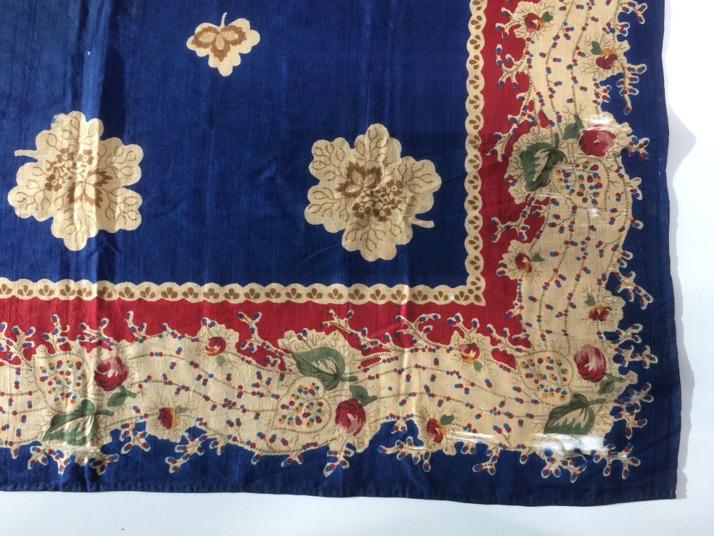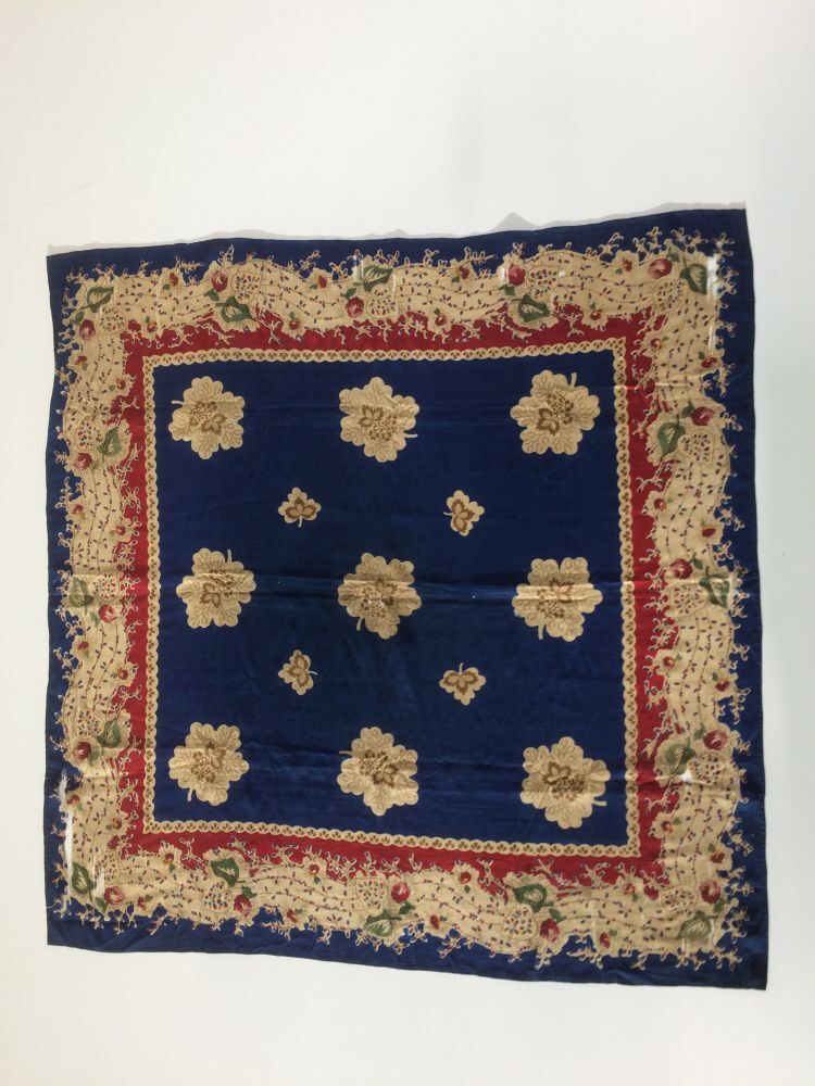 Vierkante doek of sjaal van blauw bedrukte zijde met een rand van bloemen, blaadjes en stippen
