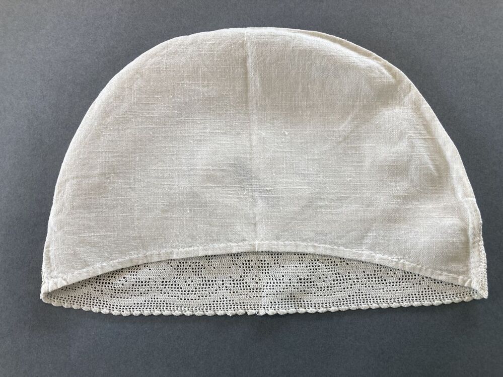 Tipmuts van linnen en katoen met achterstrook van filet haakwerk