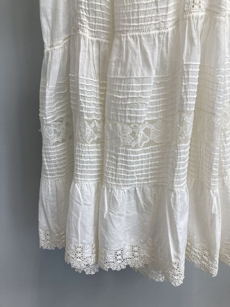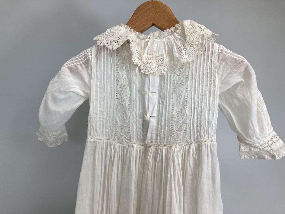 Doopjurk van wit katoenen batist met rimpelkraag en lange mouwen, met zwitser broderie en machinaal kloskant