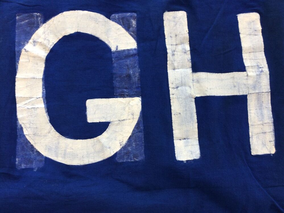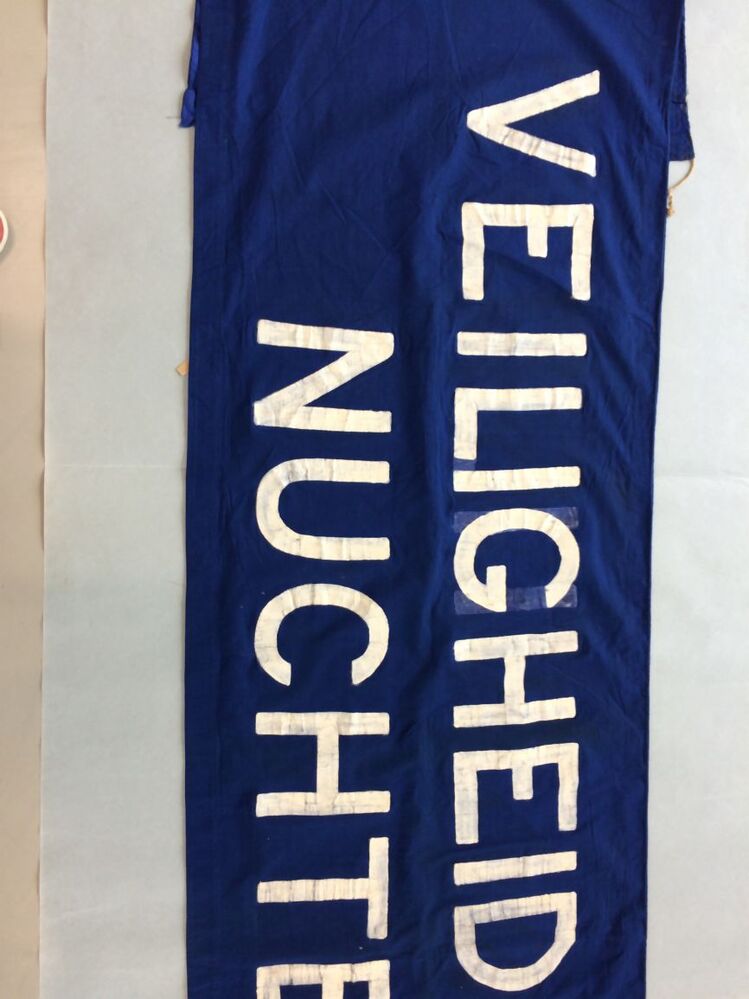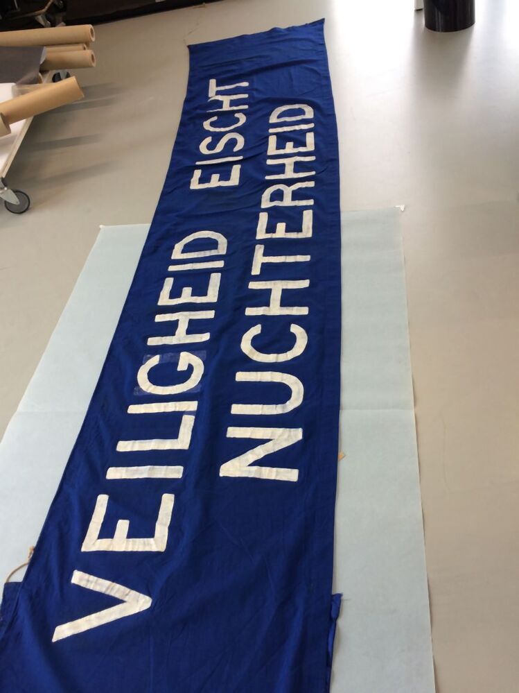 Spandoek, blauw met witte beschildering, VEILIGHEID EISCHT / NUCHTERHEID