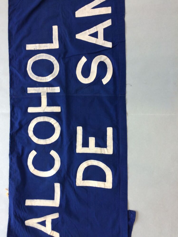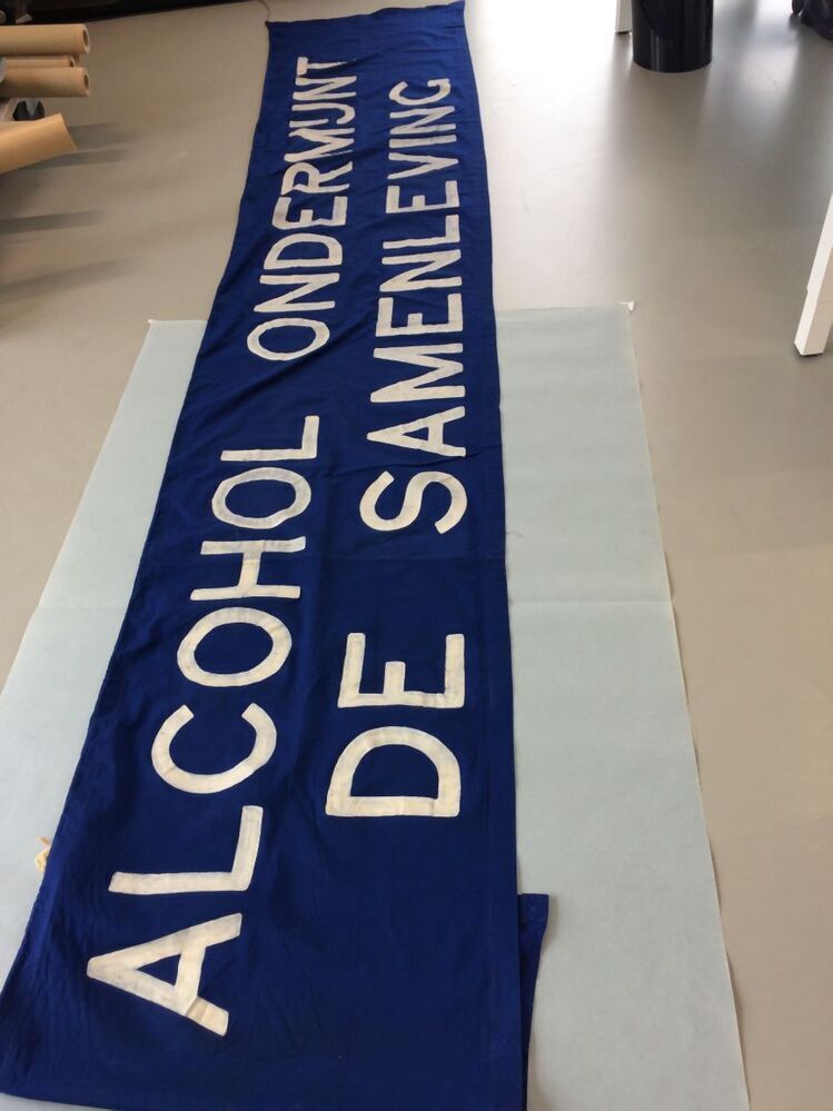 Spandoek, blauw met witte beschildering, ALCOHOL ONDERMIJNT / DE SAMENLEVING