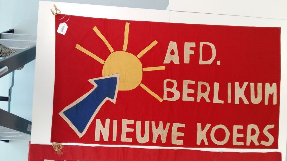 P.V.D.A. vlag van de afdeling Berlikum, Nieuwekoers, rood fond, witte geapplikeerde letters en stralende zon met pijl