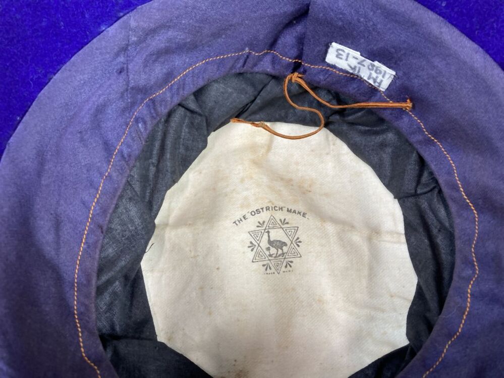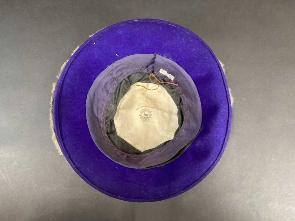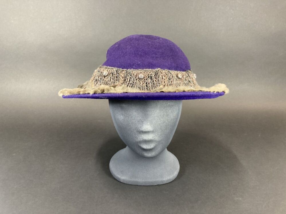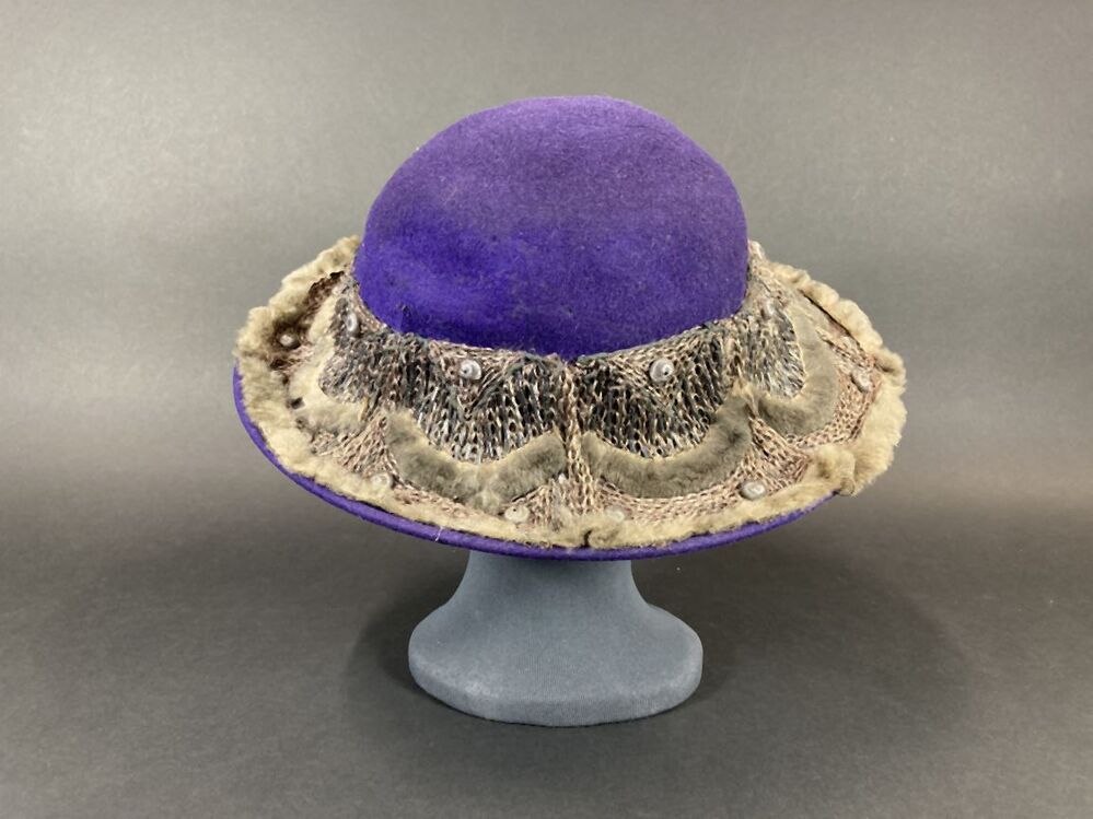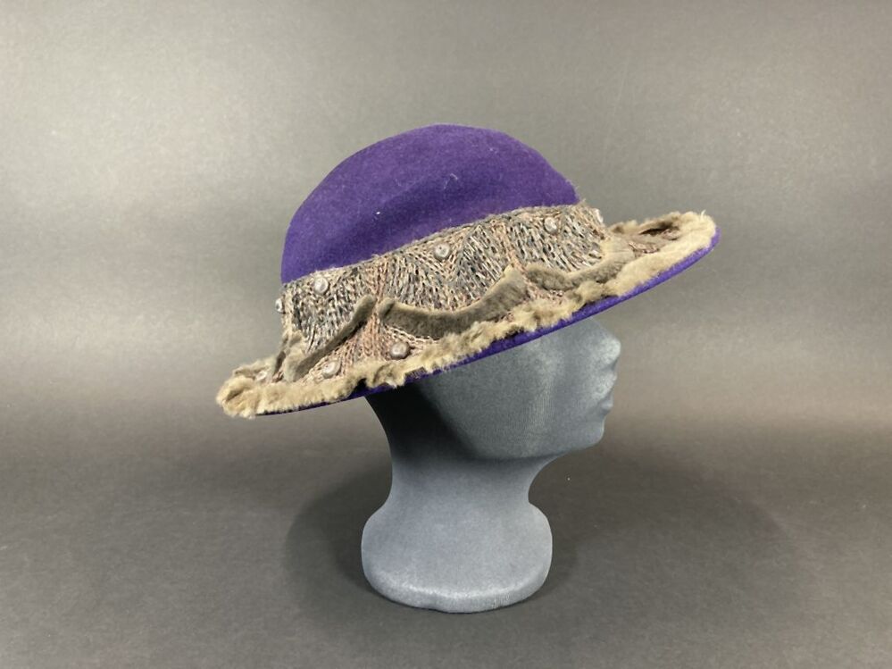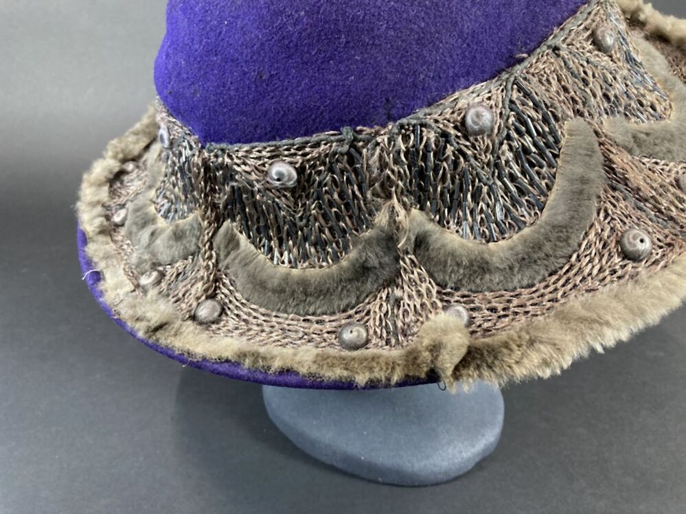 Paarse vilthoed met wijde bol die vloiend overloopt in rand met grijsbruine applicaties