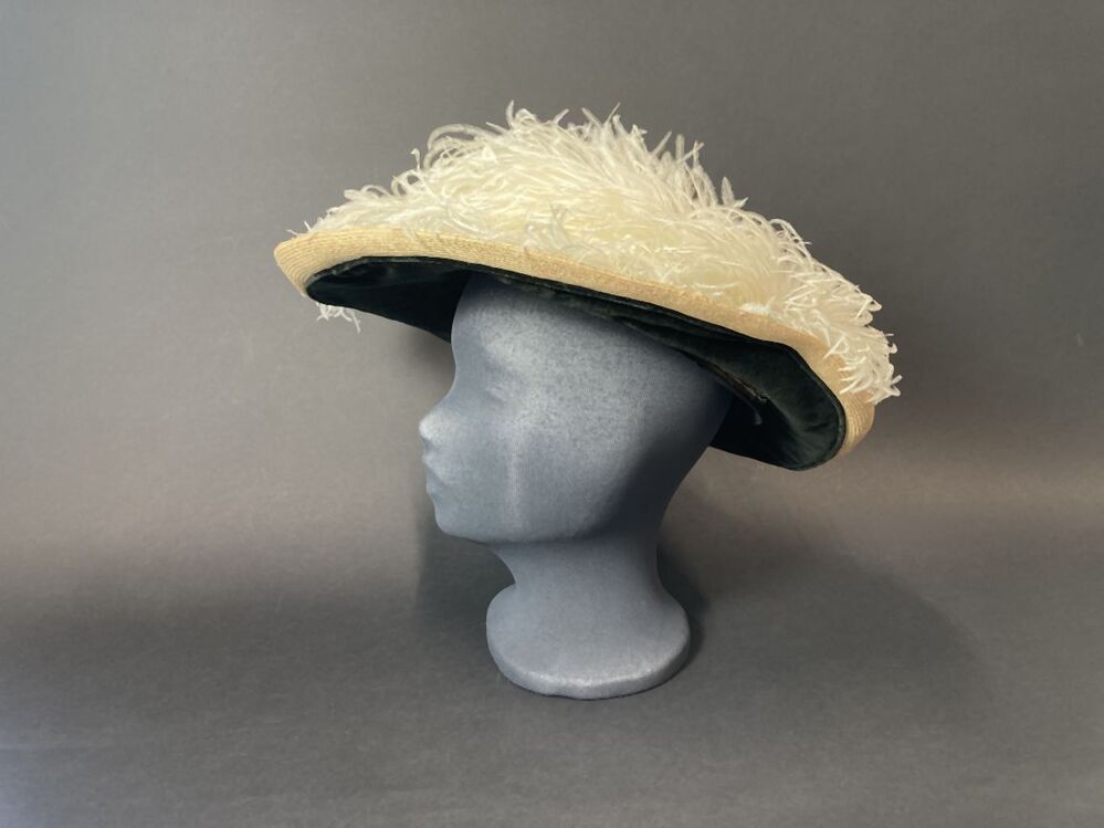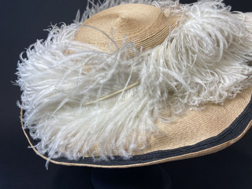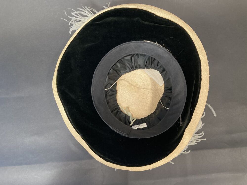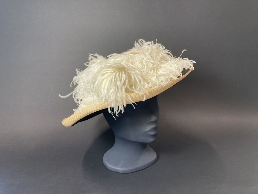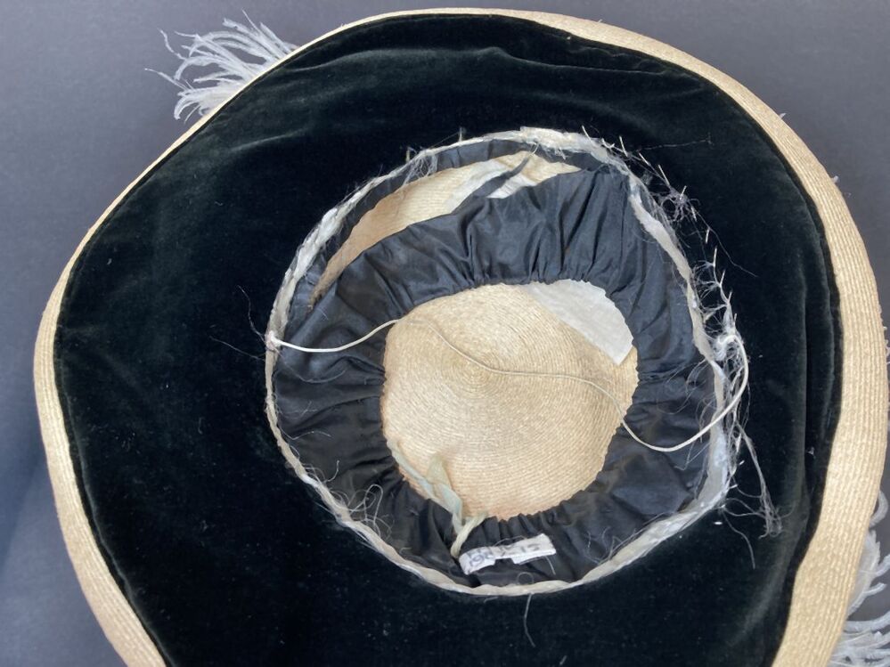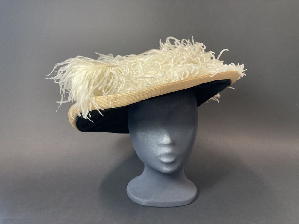 Platte hoed met wijde bol en brede rand van crème-kleurig stroband met zwart fluweel en witte struisveer