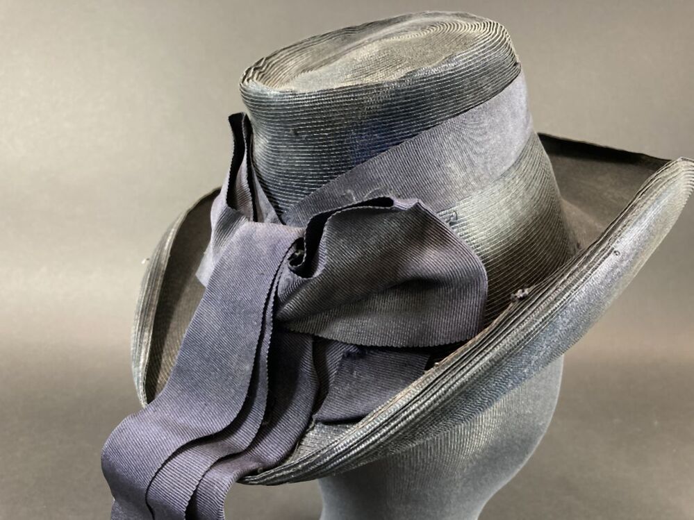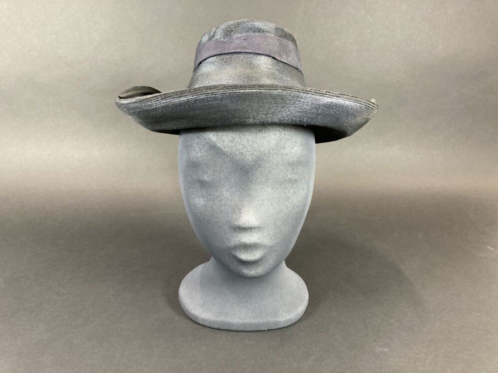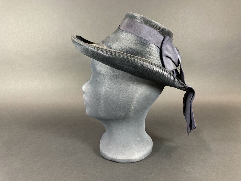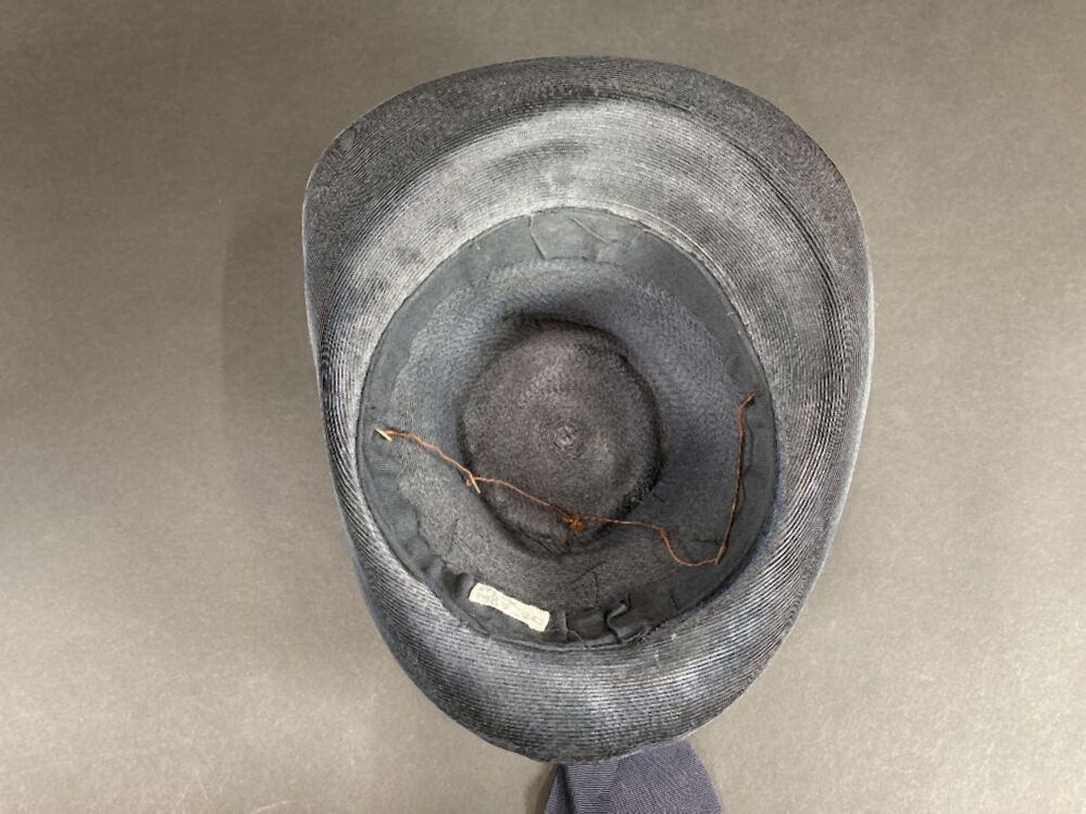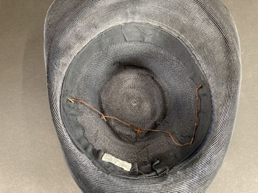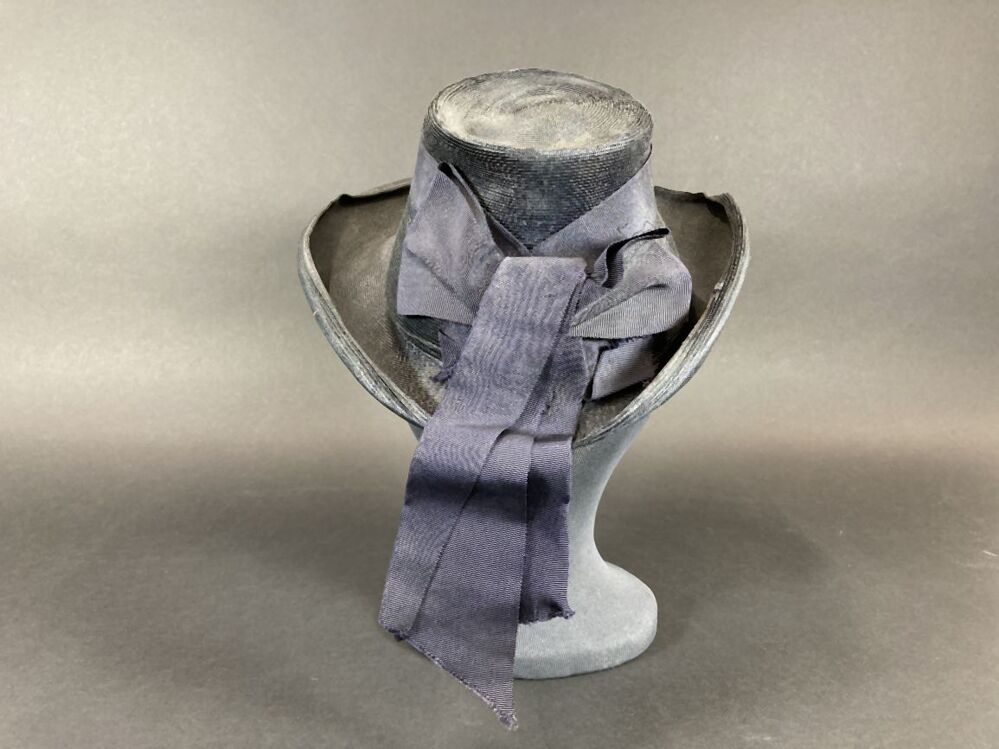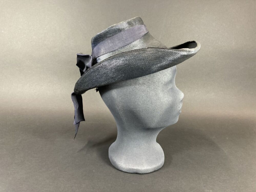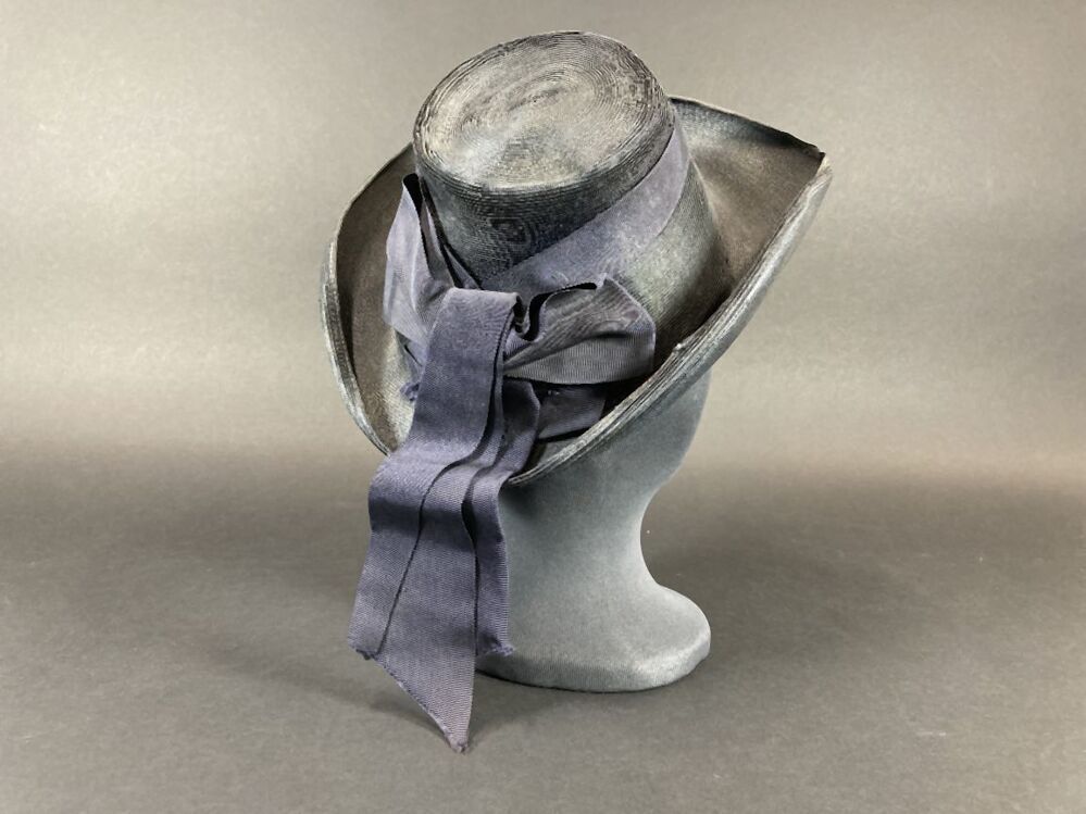 Hoed van stroband met kleine kegelvormige bol en omhooggebogen rand