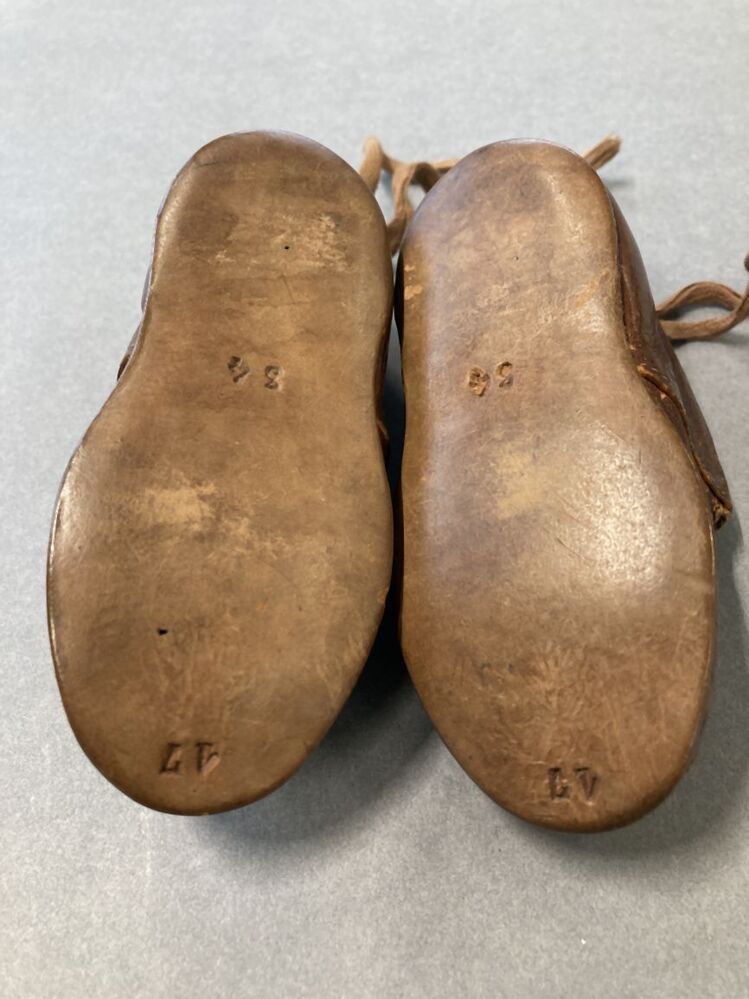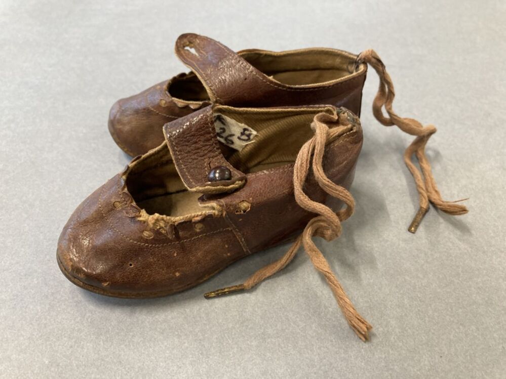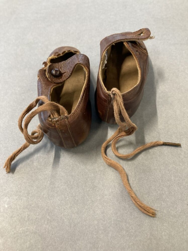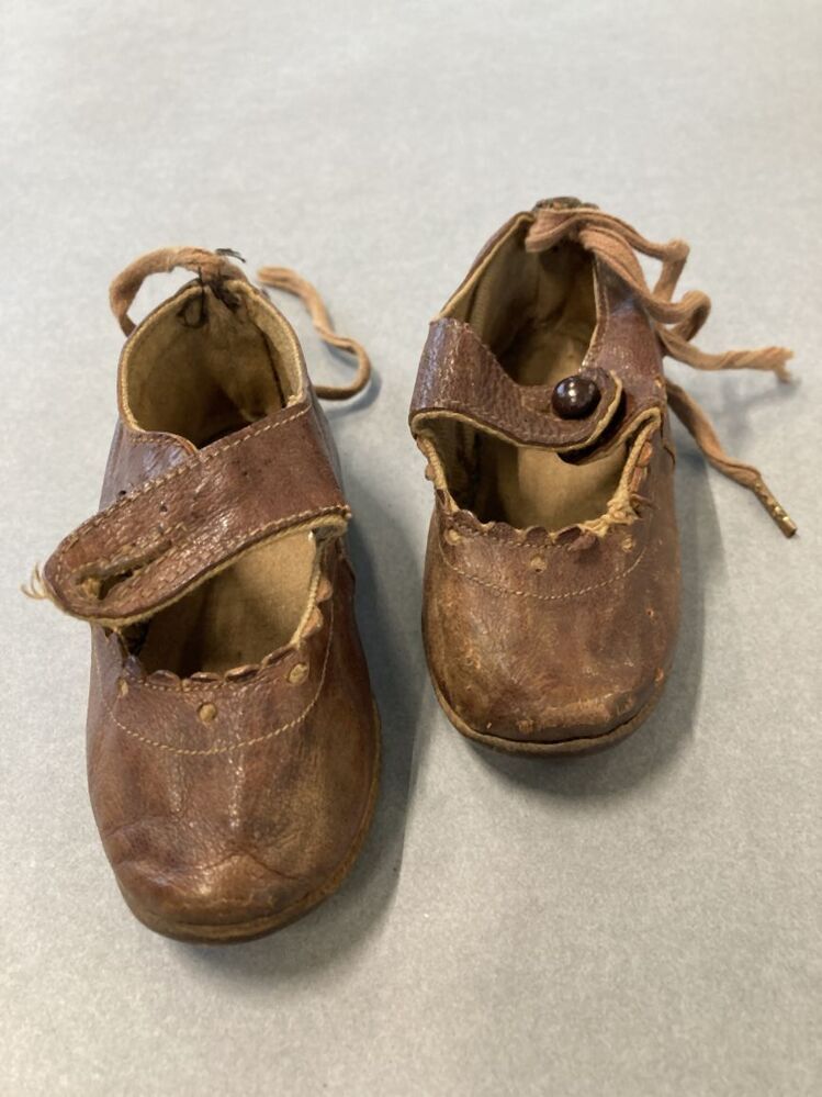 Paar bruin leren kinderschoenen met wreefband met knoopsluiting, uitsnijding op voet is geschulpt met gaatjesversiering