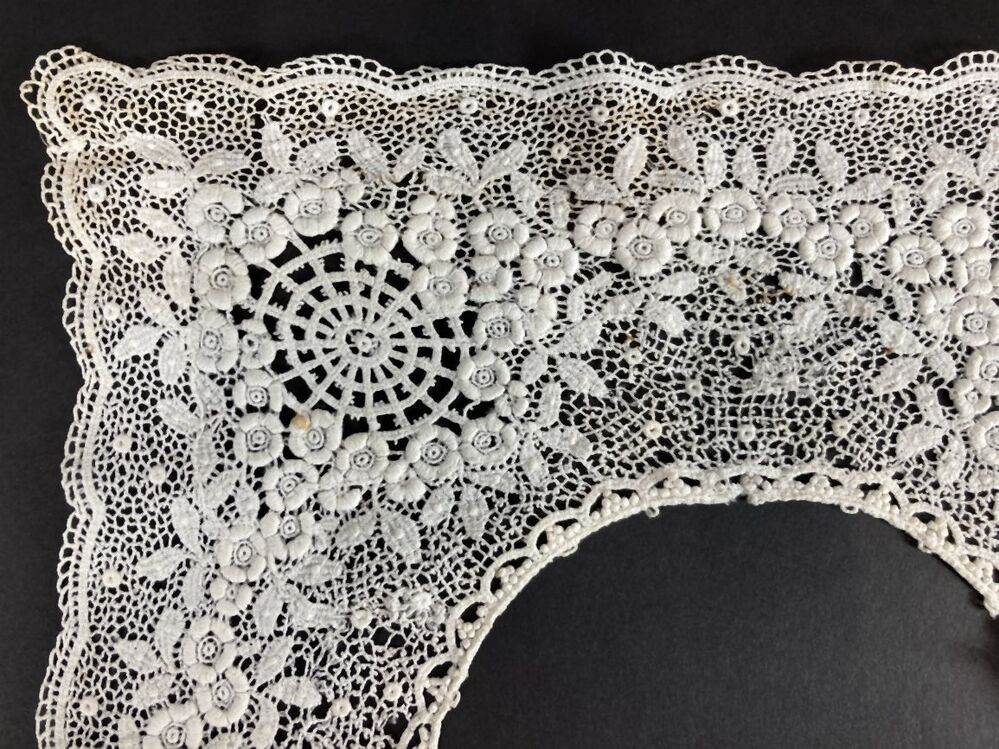 Platliggende vierkante kraag van etskant met rozetvormig bloemmotief in de hoeken op grillige grond, onderdeel van groep van drie
