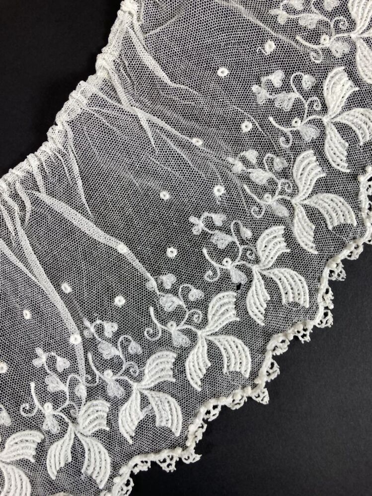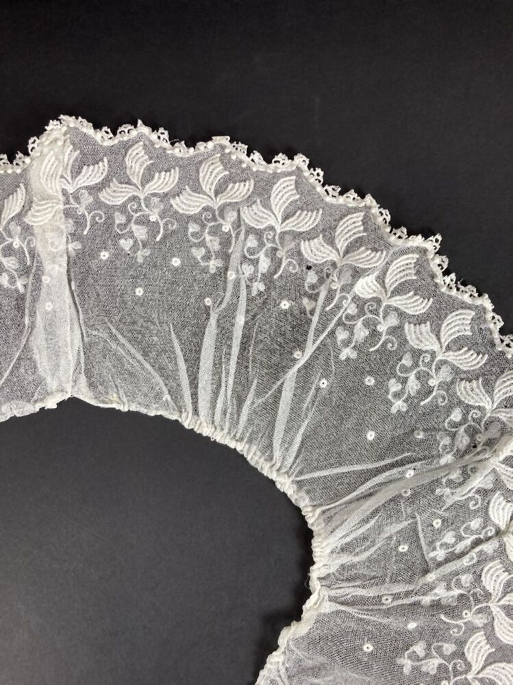 Platliggende gerimpelde kraag voor wijde hals van machinaal geborduurde tule met gestileerde asymmetrisch bladmotief, onderdeel van groep van drie