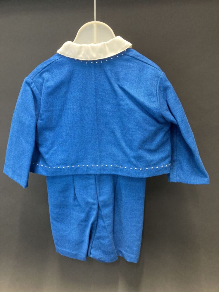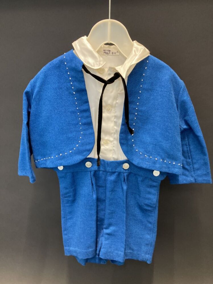 Jongenspakje van blauw katoen bestaande uit kort jasje, broek en witteblouse