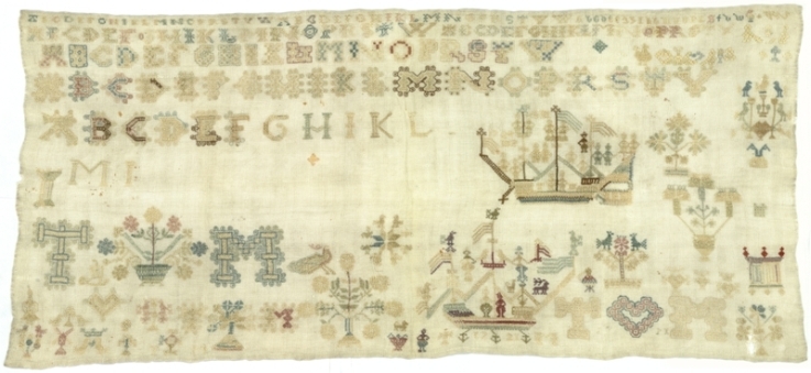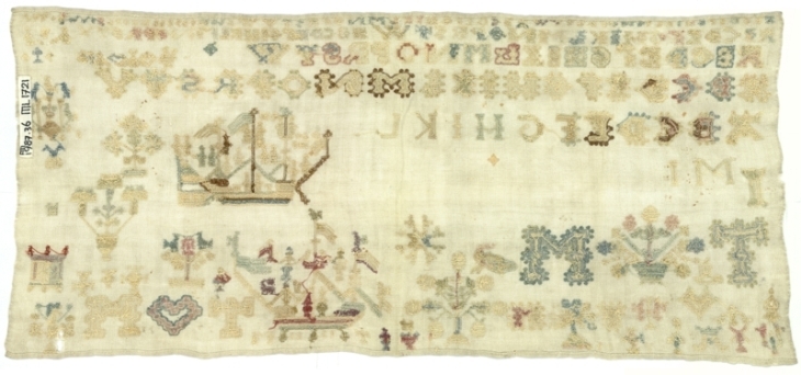 Merkletterlap van linnen geborduurd met zijde, tweemaal 1721, éénmaal 1724, zesmaal TM en twee driemasters