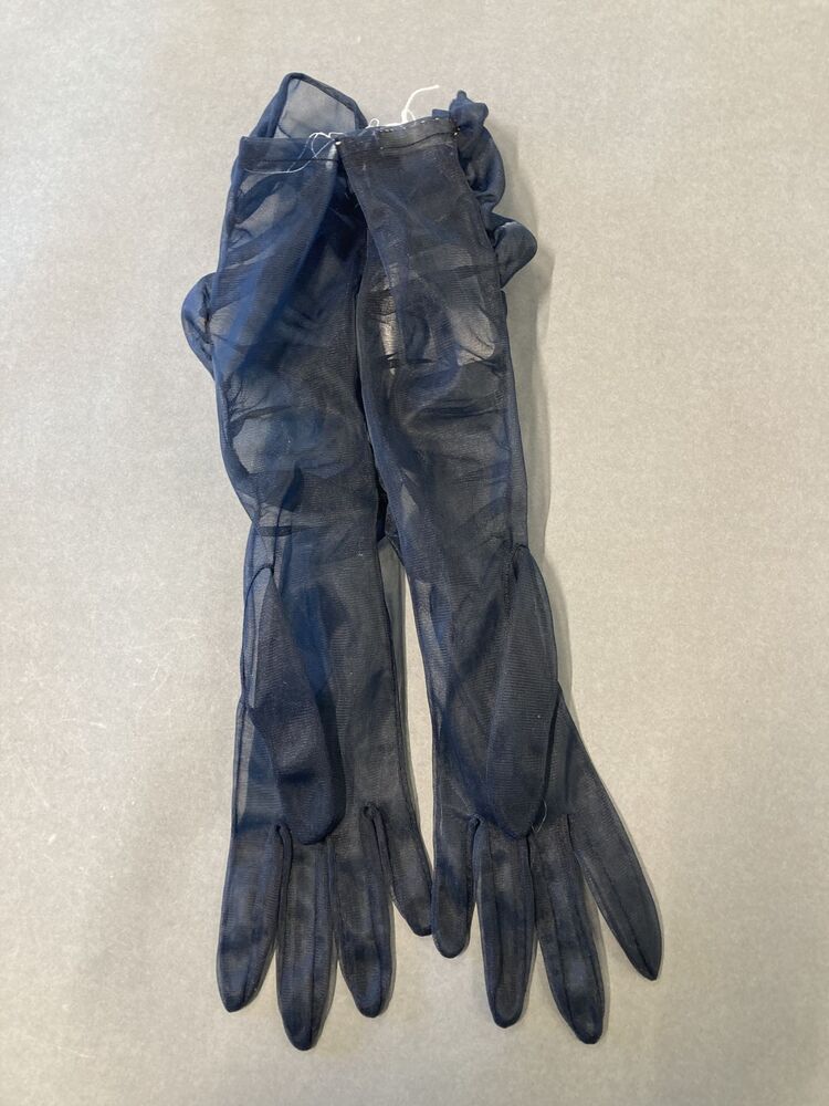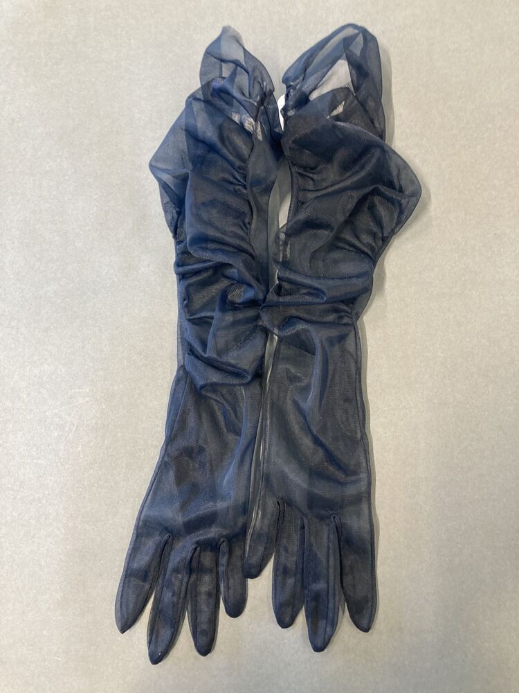halflange handschoenen van blauw transparant nylon, met gerimpelde bovenkant
