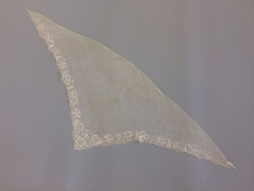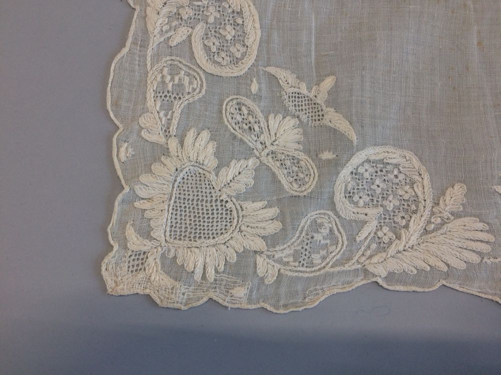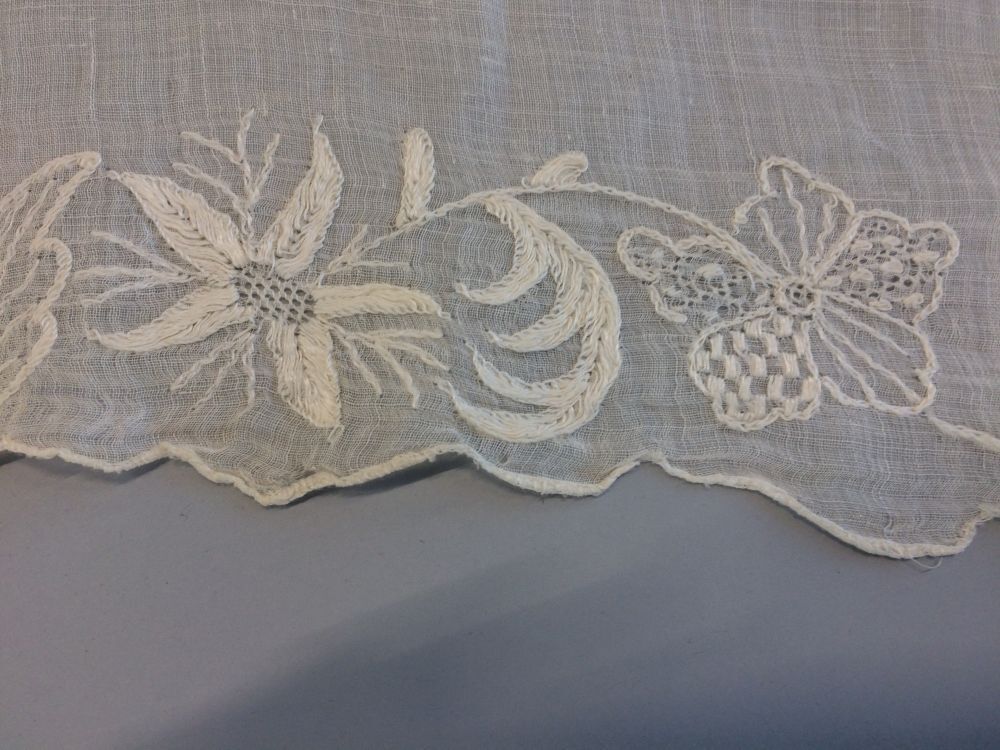 Tipdoek van transparant neteldoek met geschulpte zoom waarlangs bloemrank in eenvoudig point clair
