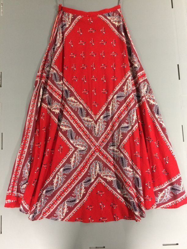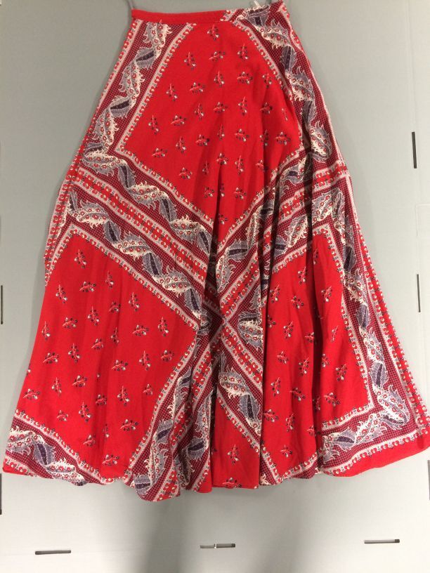 Lange klokrok gemaakt van zeven rode boerenzakdoeken, hippie tijd
