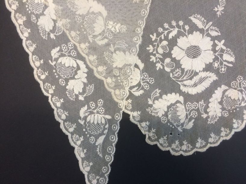 Tipdoek van witte fijnmazige tule met tamboereerwerk, bezaaid met kleine bloemen, en grotere in de rand