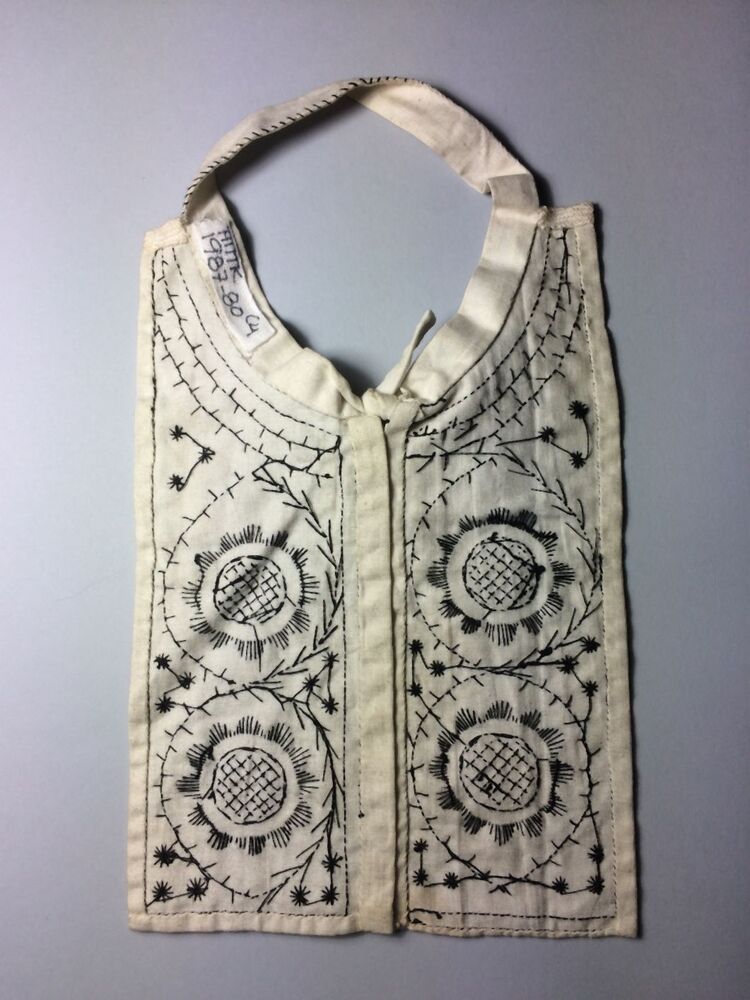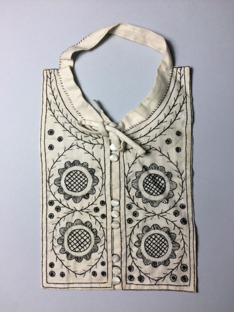 Eén van zeven befjes van wit linnen met zwart borduursel waarop gestyleerd bloemmotief en parelmoerknoopjes