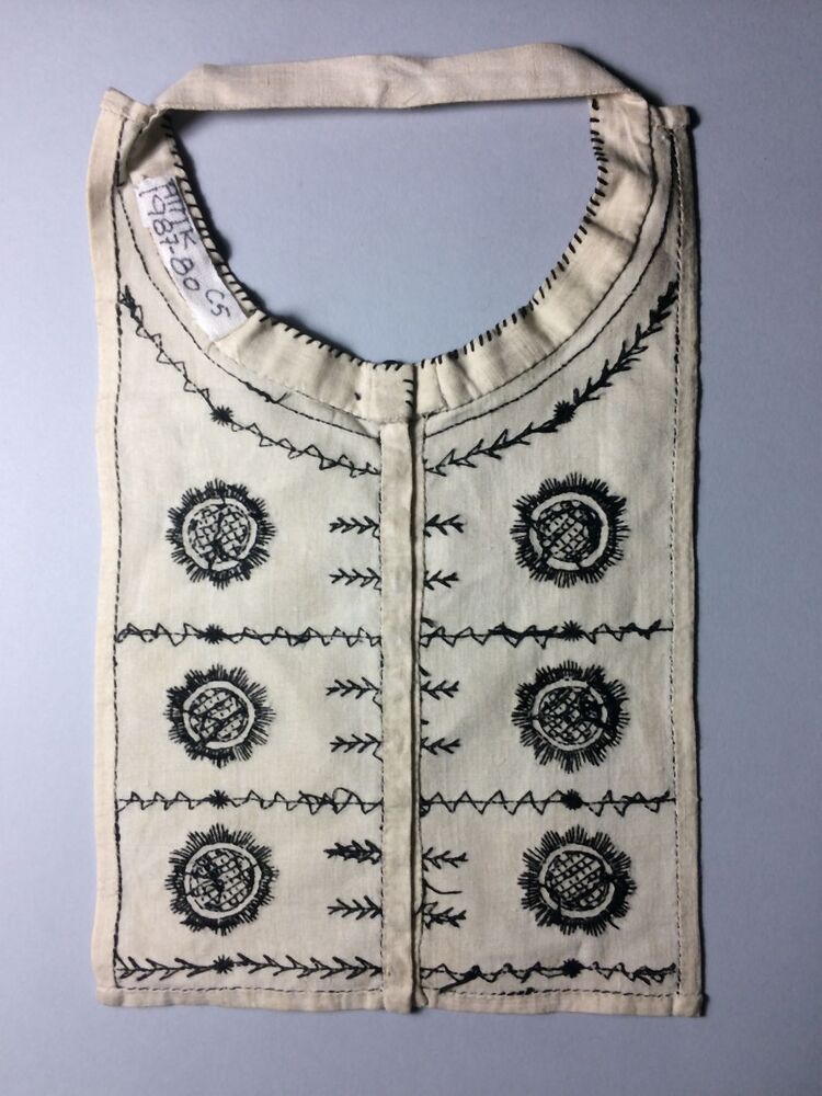 Eén van zeven befjes van wit linnen met zwart borduursel waarop gestyleerd bloemmotief en parelmoerknoopjes