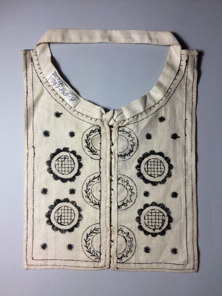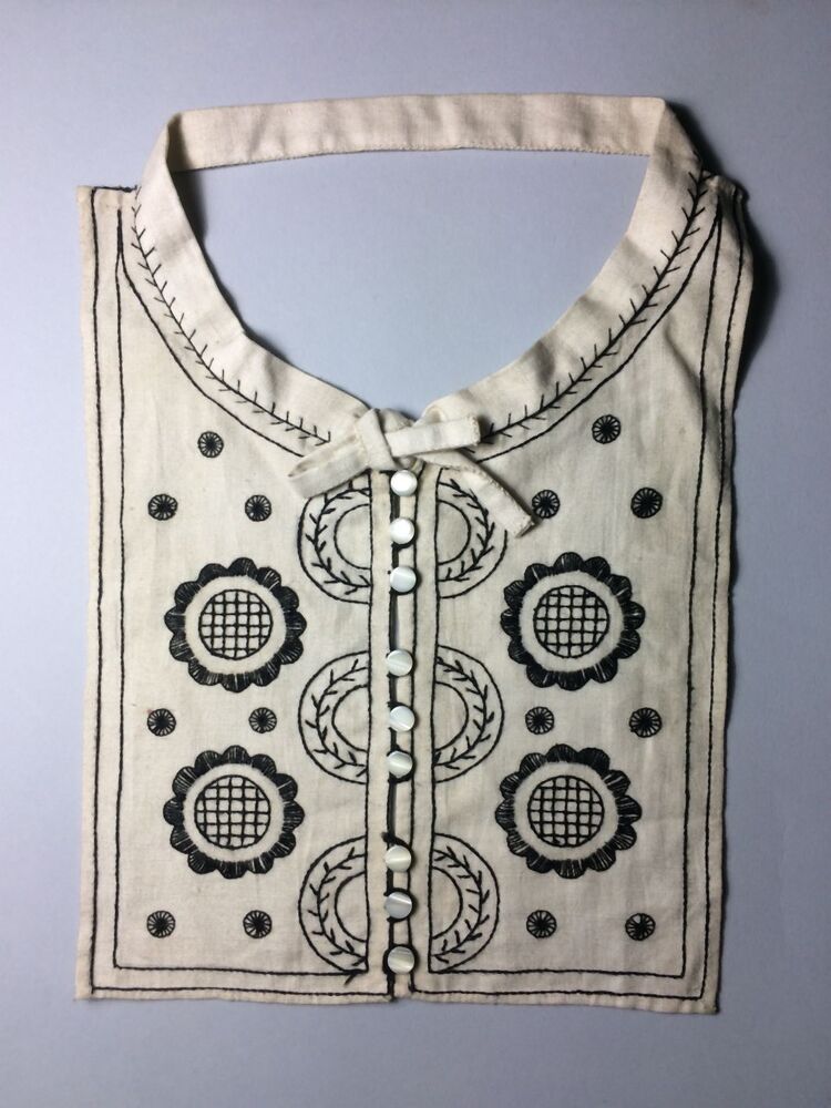 Eén van zeven befjes van wit linnen met zwart borduursel waarop gestyleerd bloemmotief en parelmoerknoopjes
