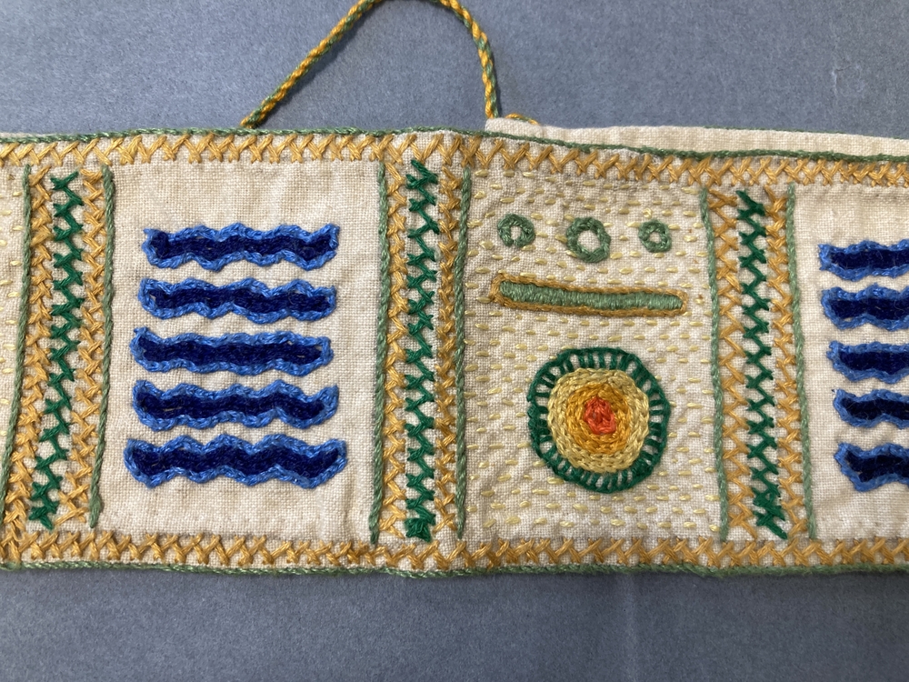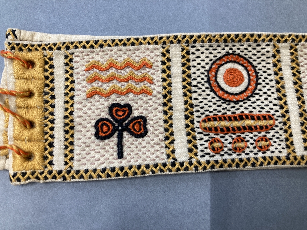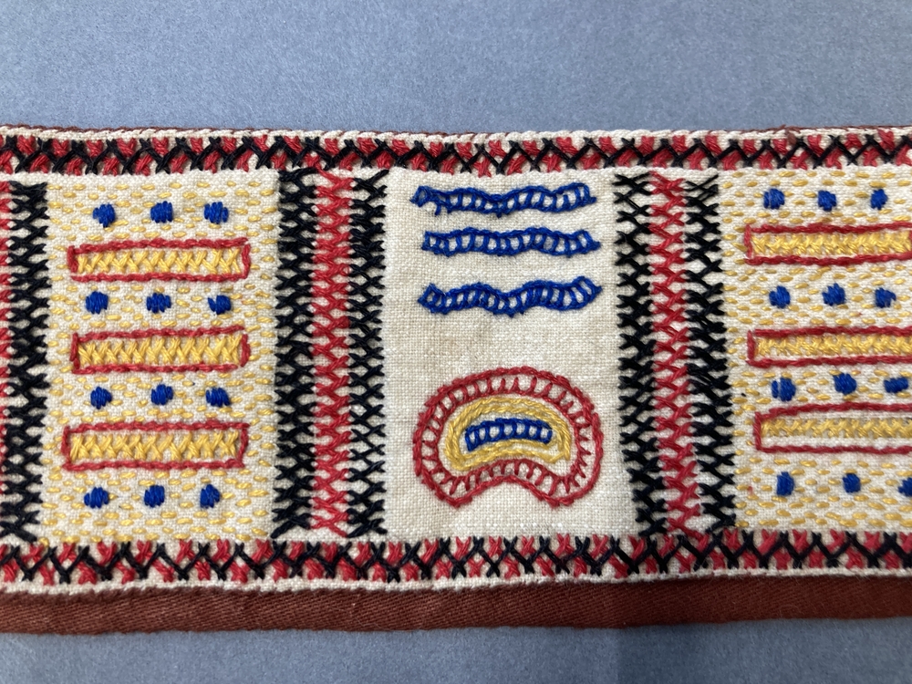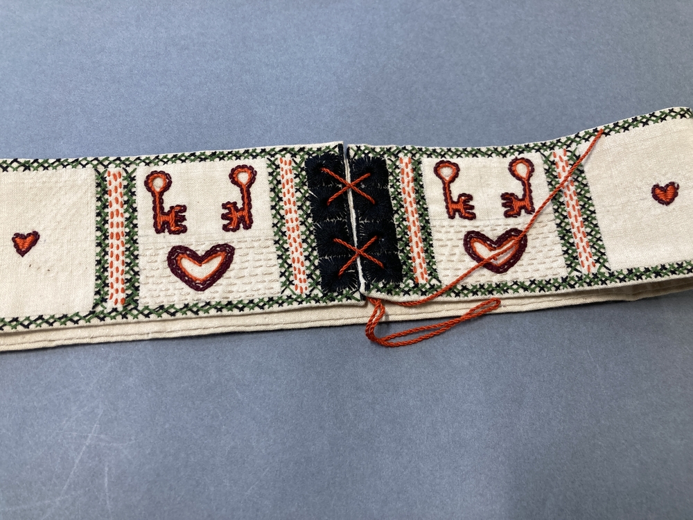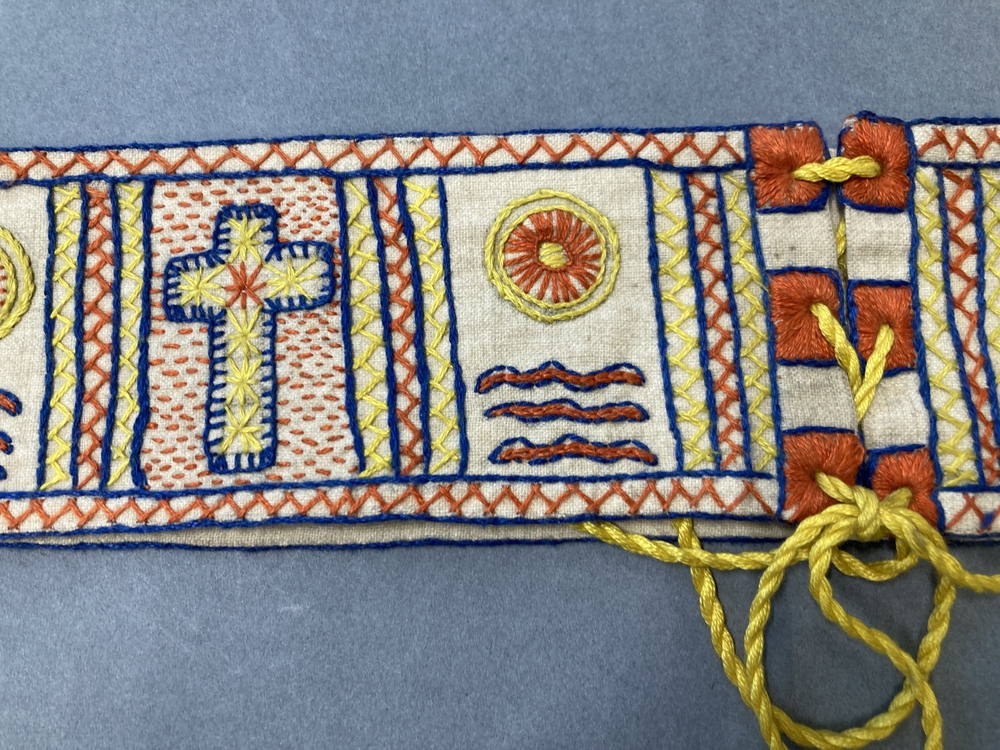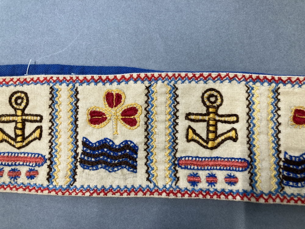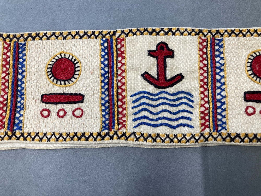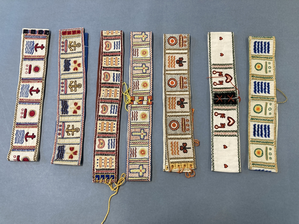 Een van zeven ceintuurs van wit halflinnen, verdeling in rechthoeken, anker, pompebleden, klaver drie, hart, kruis