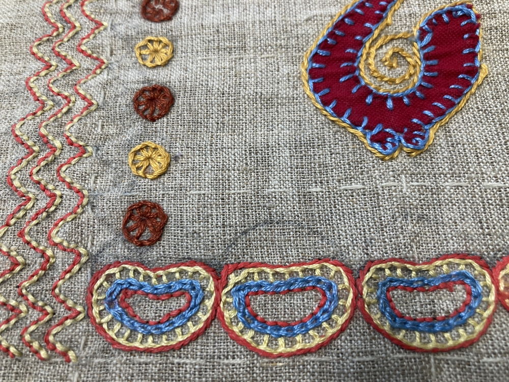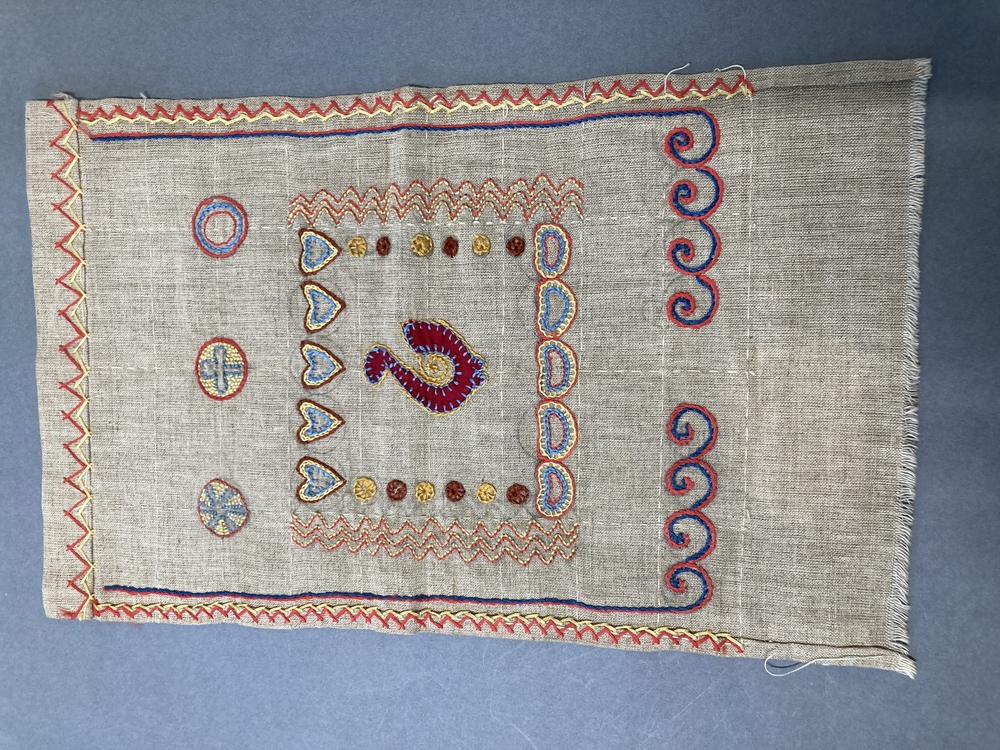 Onaf kleedje van ongebleekt halflinnen met applikatie en vrij borduurwerk