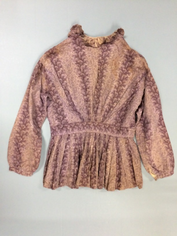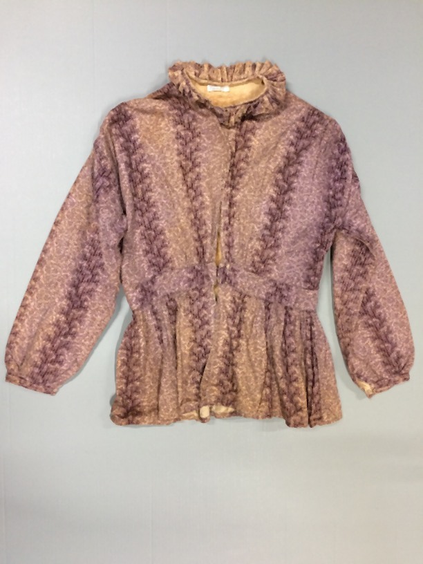 Jak, paars wit bedrukt katoen, molton katoenen voering, rouche langs hals