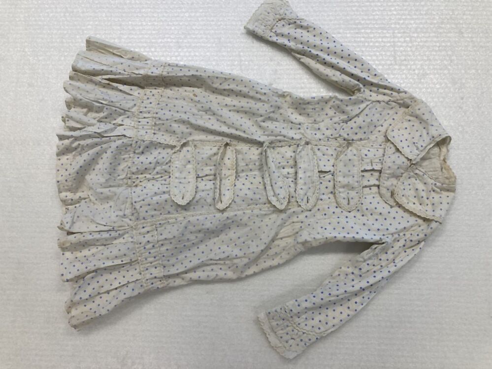 Jurkje, wit katoen bedrukt met blauwe stippen, afgezet met broderie en zigzagband, lummeltjes