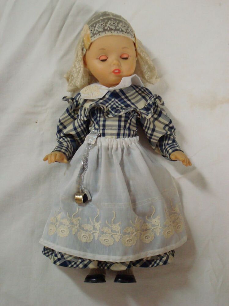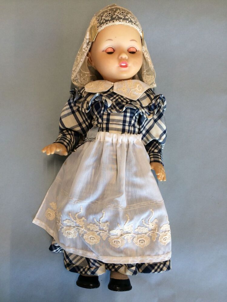 Pop Anne met geruite blauw-witte japon, neteldoekse schort met bijpassend kraagje, chatelaine, oorijzer en flodder