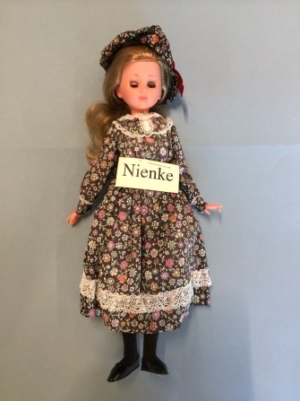 Klederdrachtpop, genaamd Nienke, met bruine jurk met gekleurde bloemen en kanten stroken