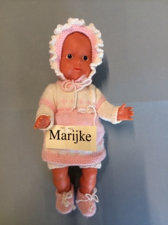 Babypop, genaamd Marijke, met rose-wit gebreide jurk, muts en slofjes