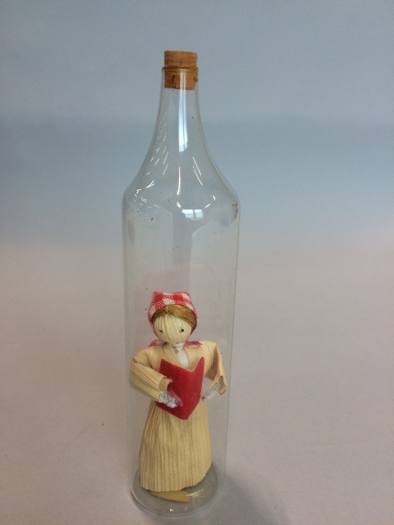 Rieten pop met rood boek en rood-wit geblokte hoofddoek in fles