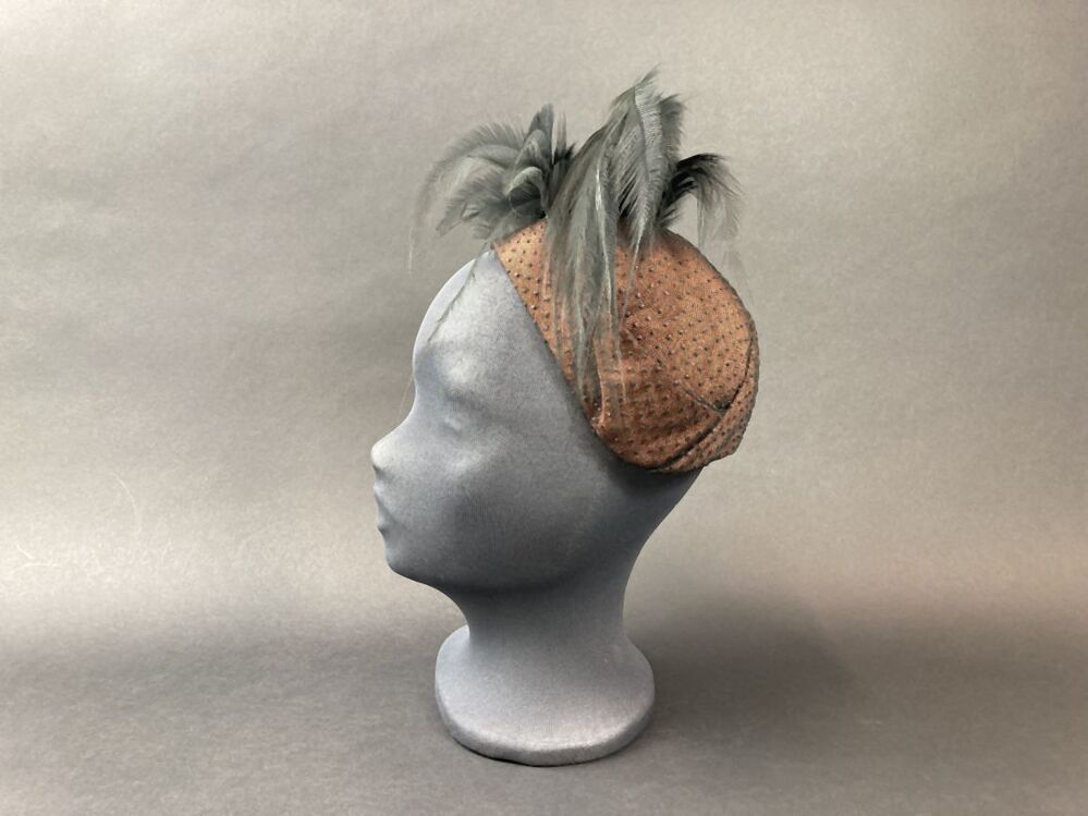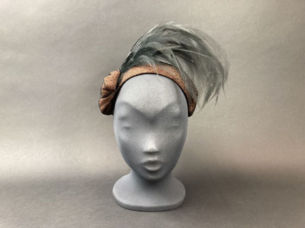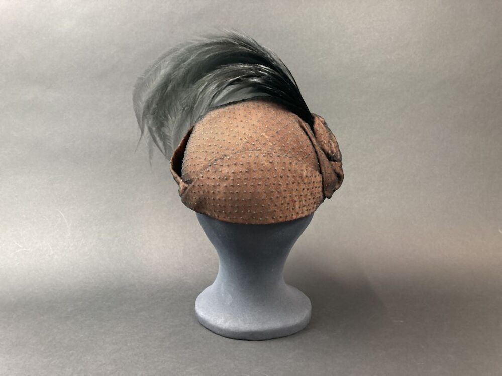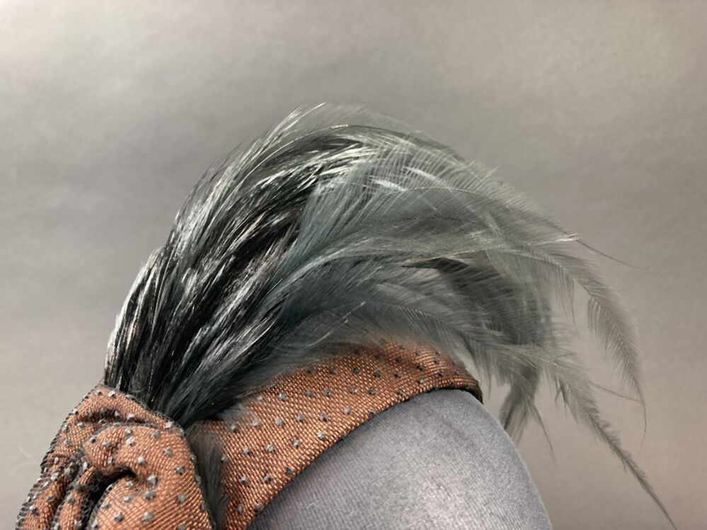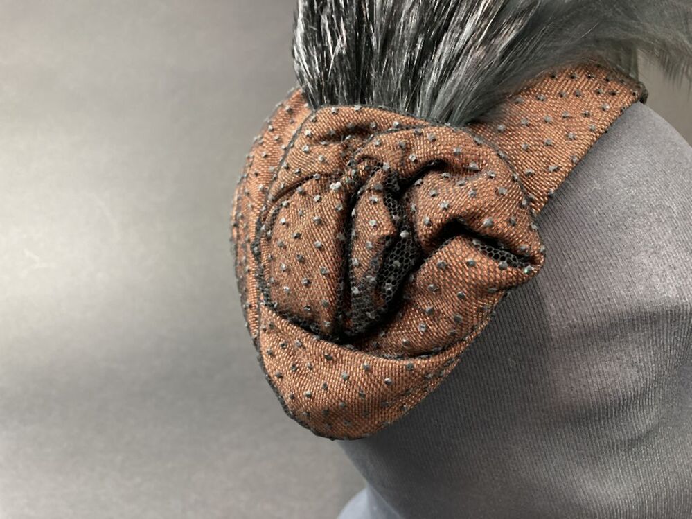 Randloos hoedje, bruin, overtrokken met zwart genopte tule en zwarte aigrette