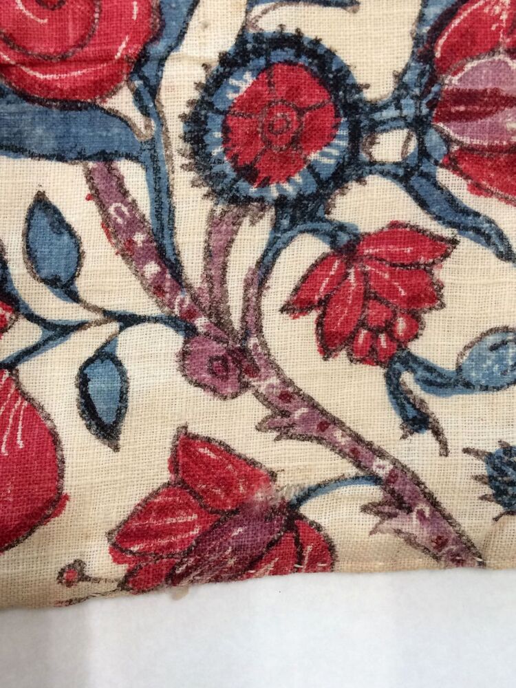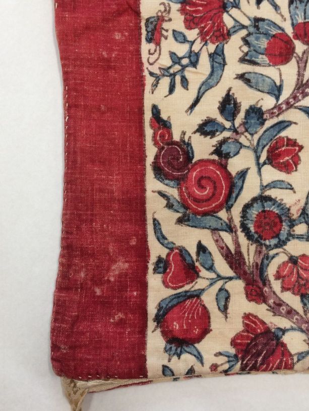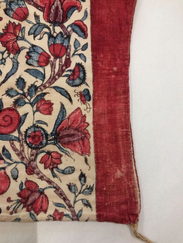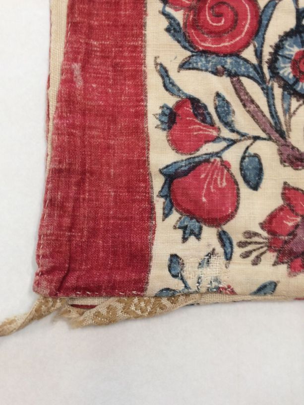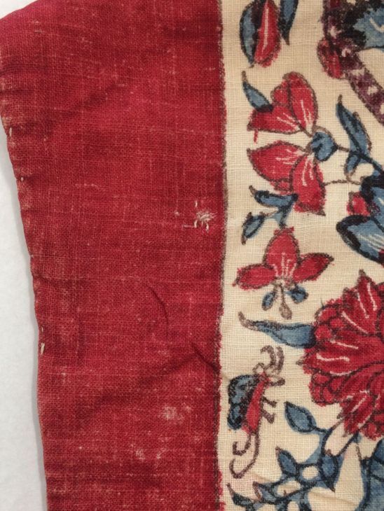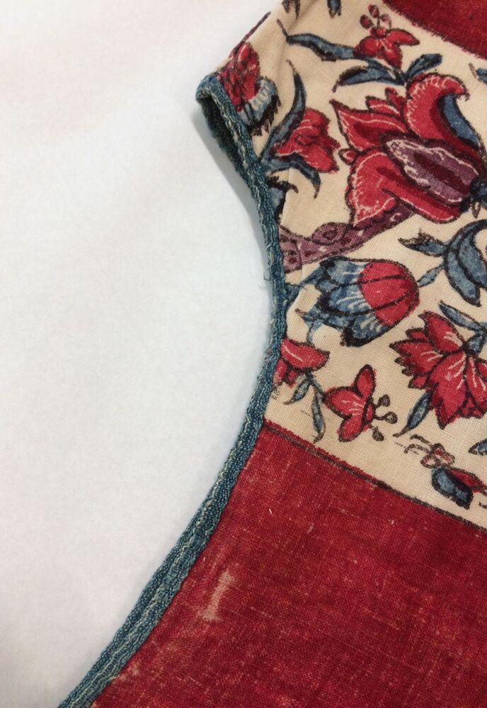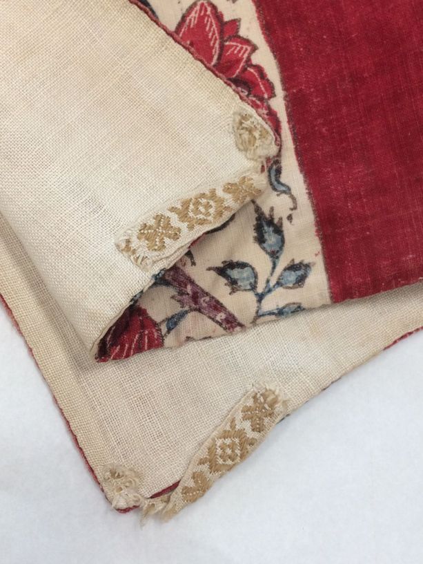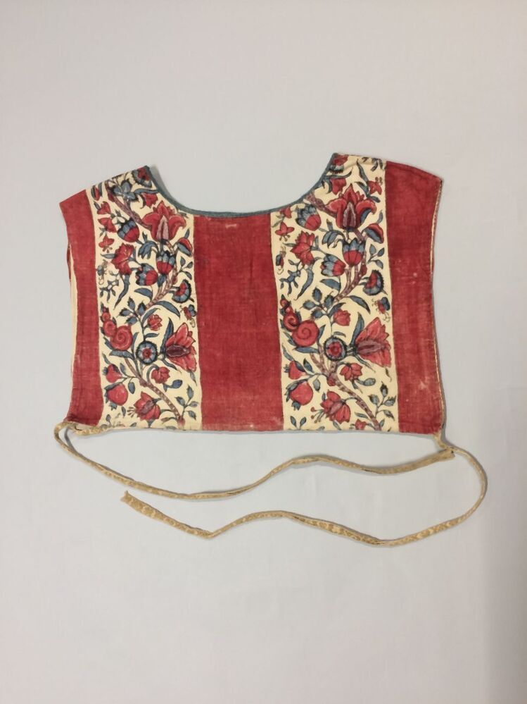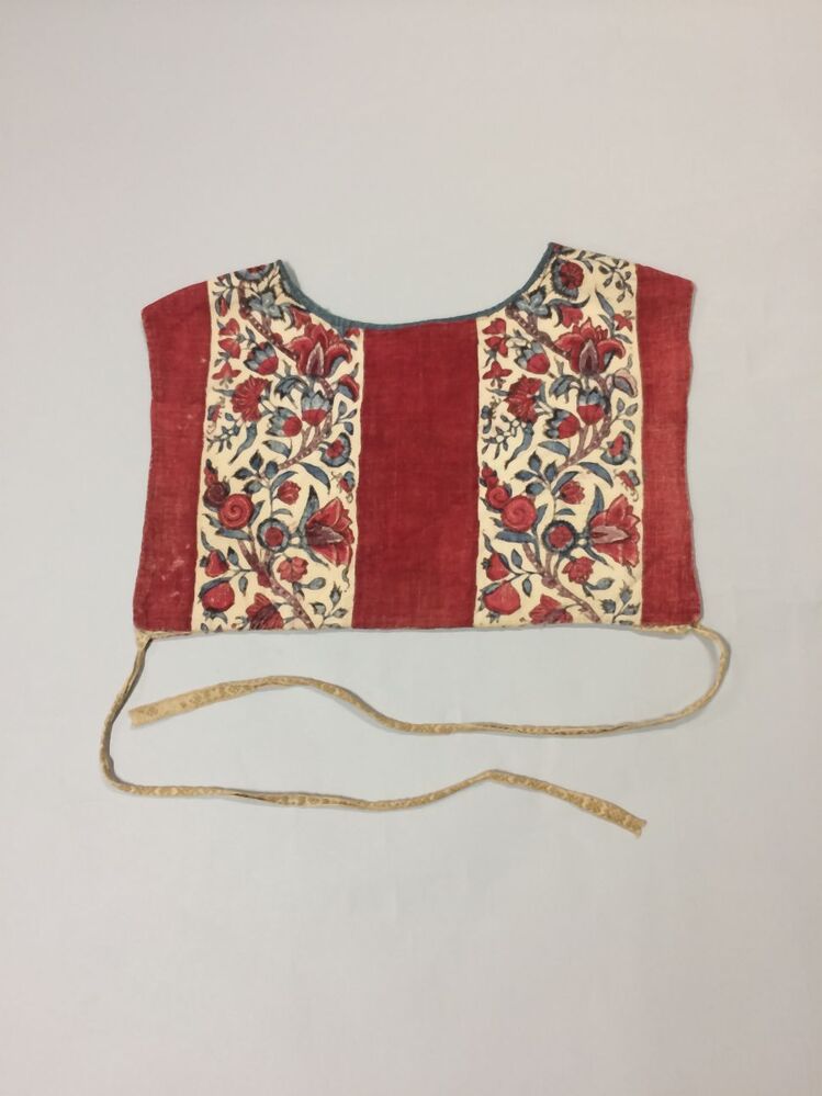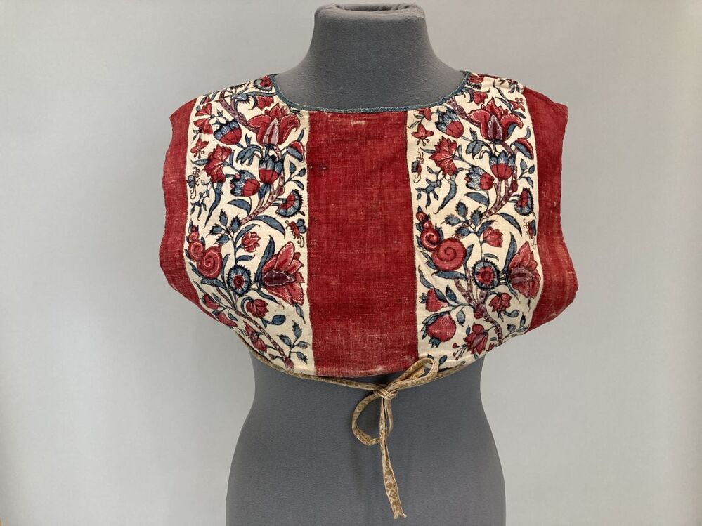Sitsen vrouwenkroplap ofwel onderst, gestreept, afwisselend rode baan en bloemrank op witte grond