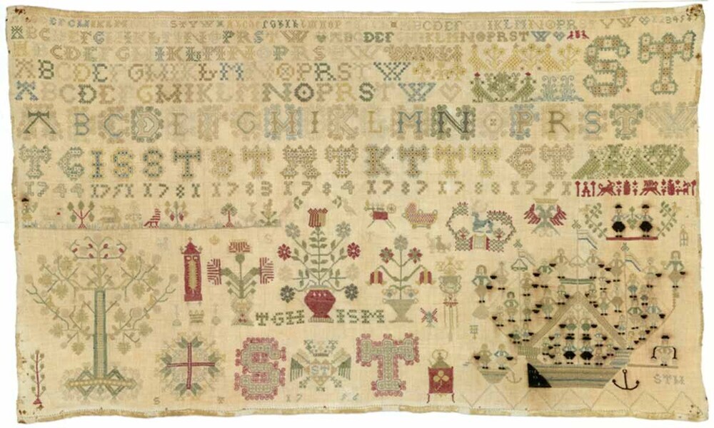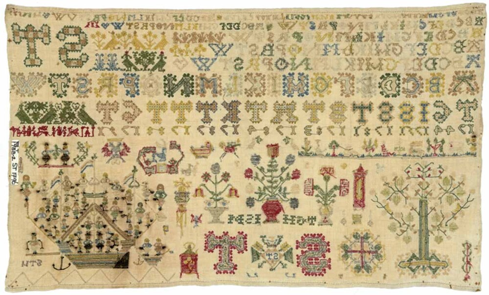 Lettermerklap, met schip en initialen met jaartallen, gemerkt S.T. 1796