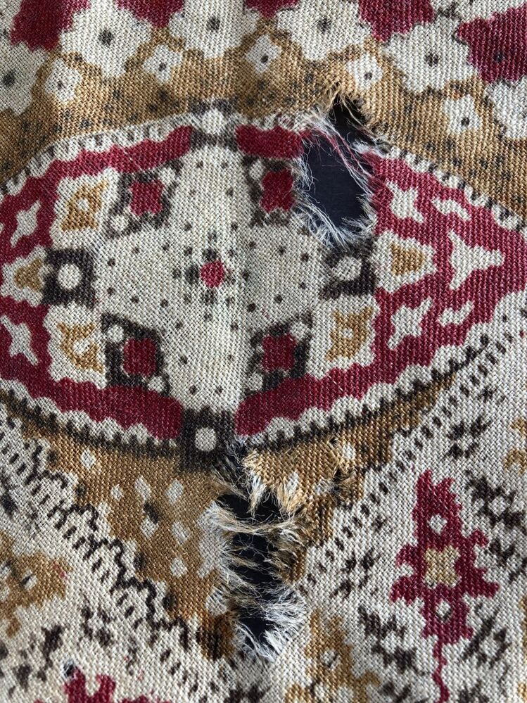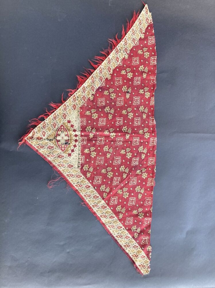 Wollen tipdoek, met rode grond, bedrukt met rand en strooimotief in gestileerde florale motieven