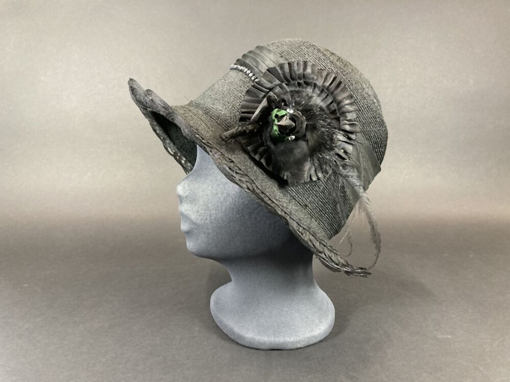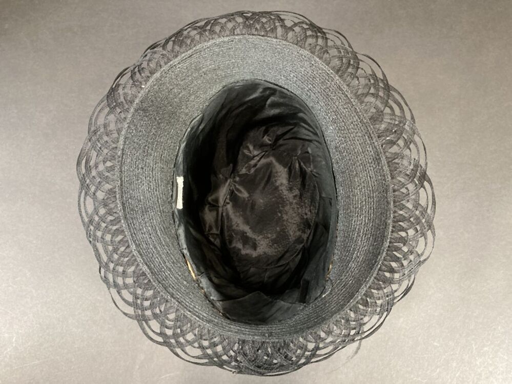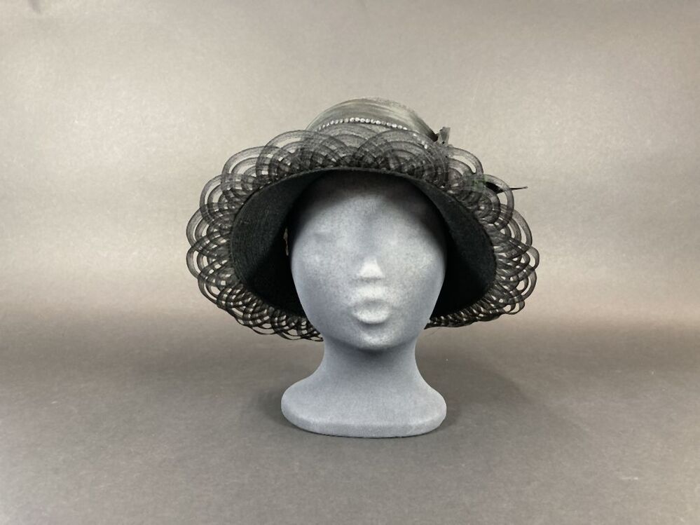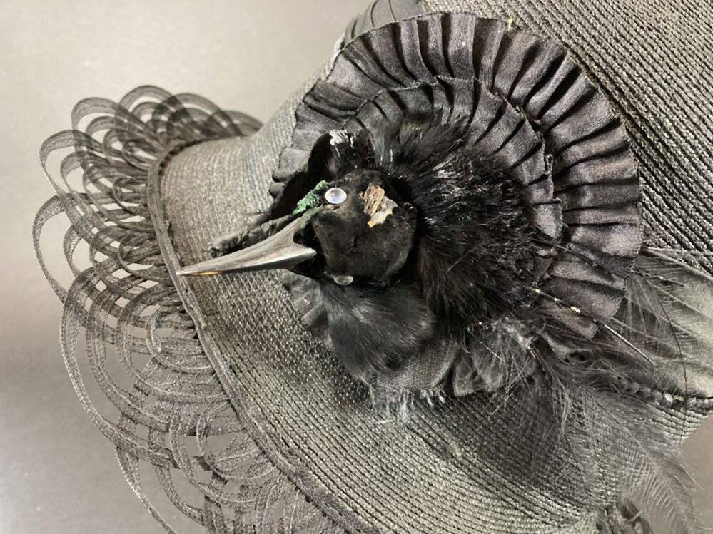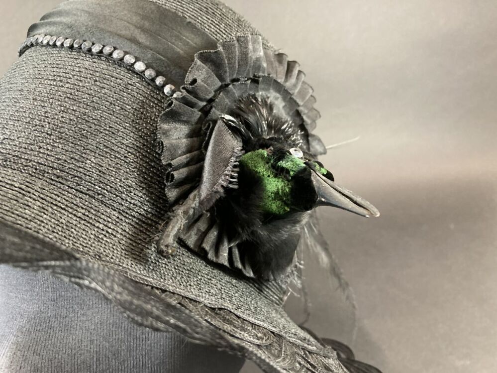 Zwarte hoed met opengewerkte rand versierd met vogelkop