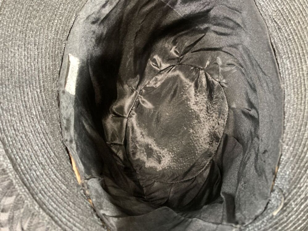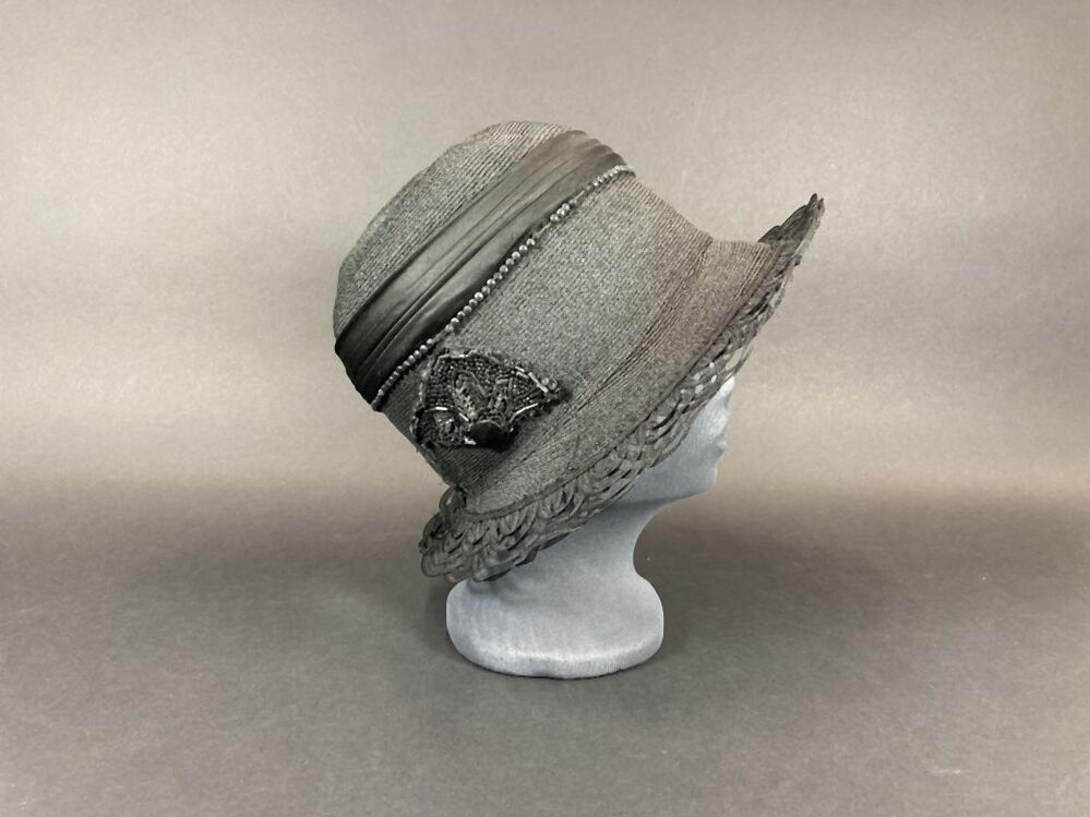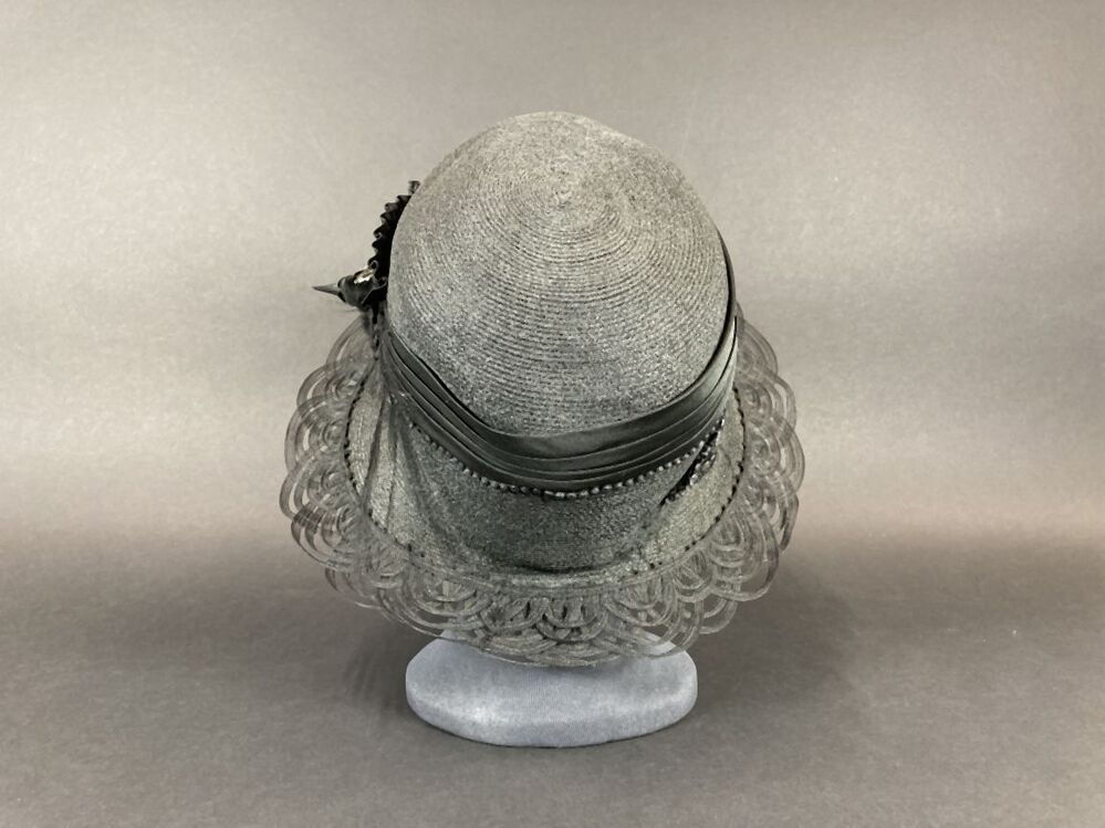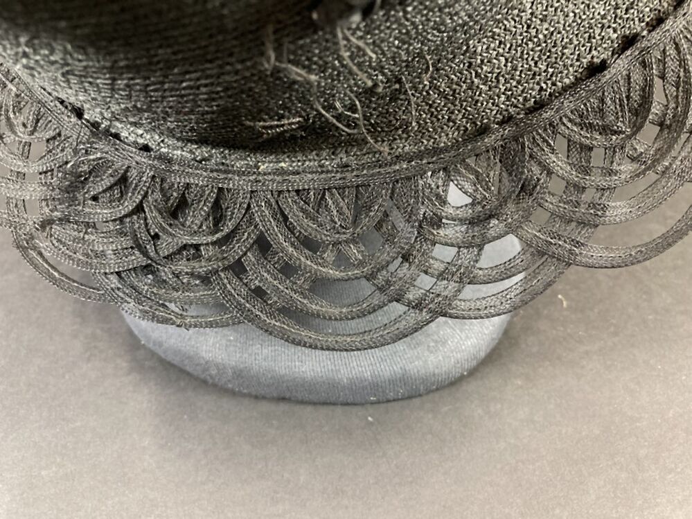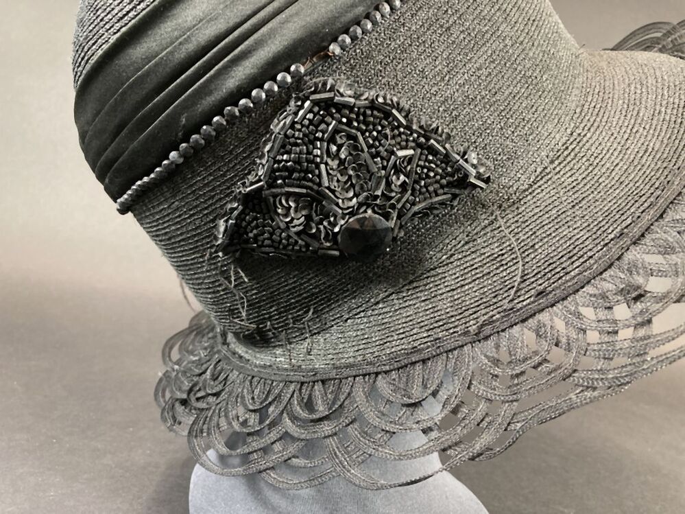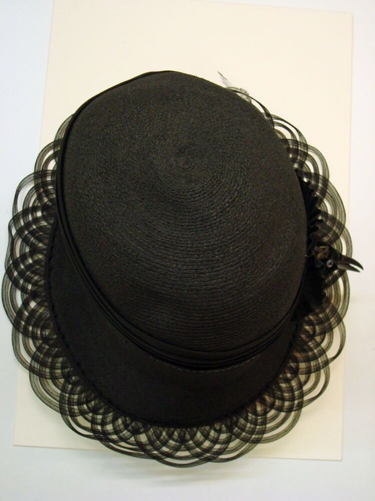 Zwarte hoed met opengewerkte rand versierd met vogelkop