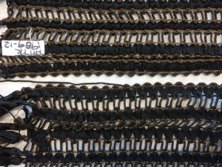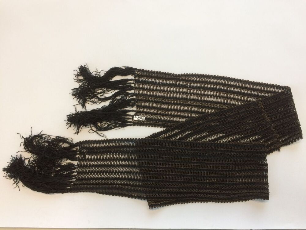 Sjaal in machinaal breisel van zigzag-band met koord en lange franje