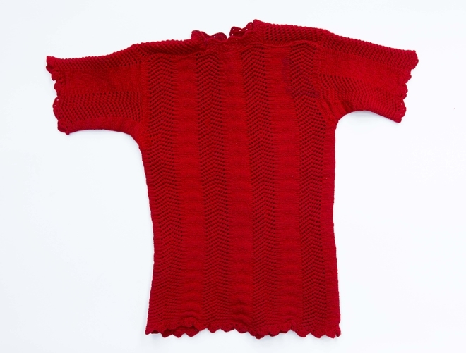 Rode borstrok met knoopsluiting van ajourbreiwerk