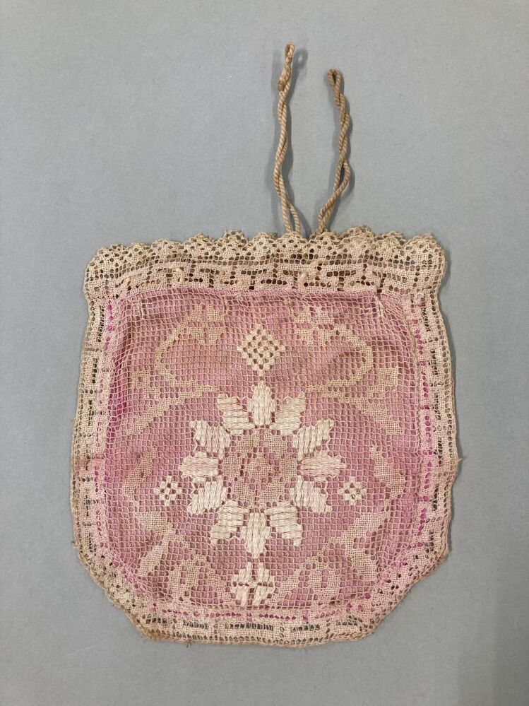 Buideltasje van filetknoopwerk met doorgestopt bloempatroon, gevoerd met hardroze kunstzijden lint
