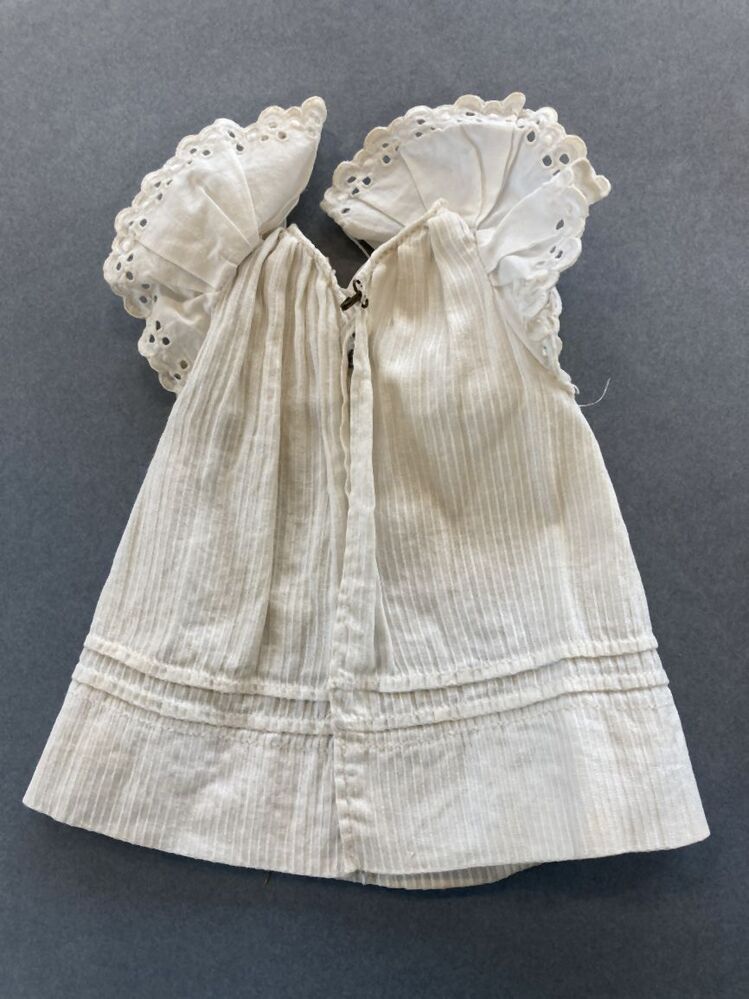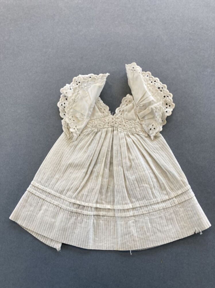 Hangschortje voor pop van gestreept wit katoen met broderie vleugelmouwtjes, oprijgsels langs zoom
