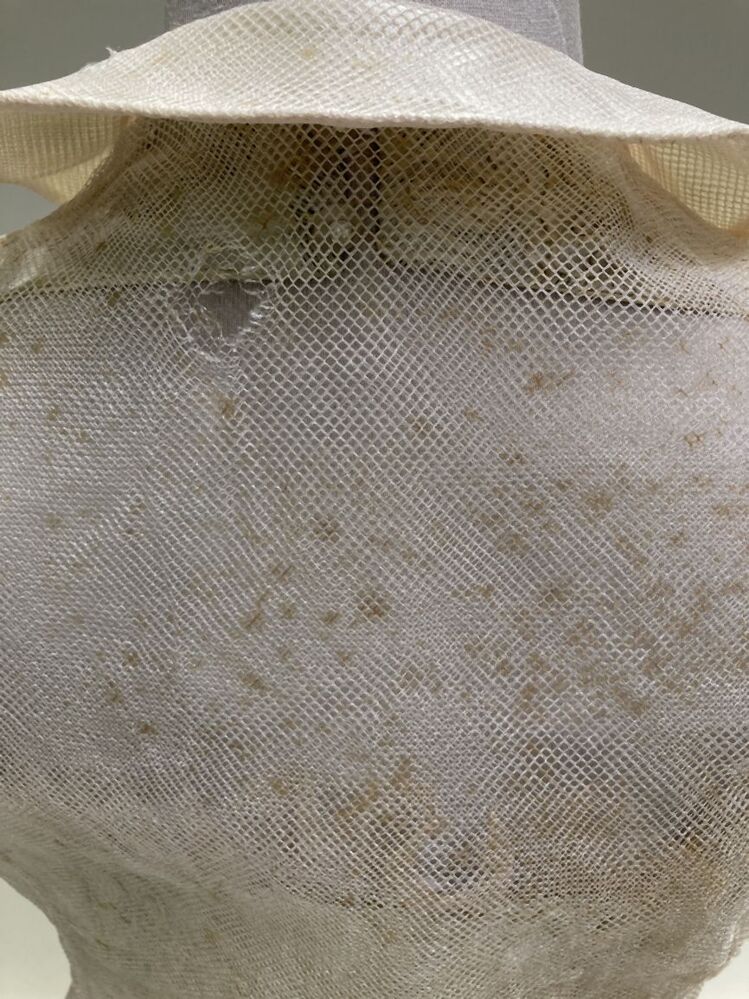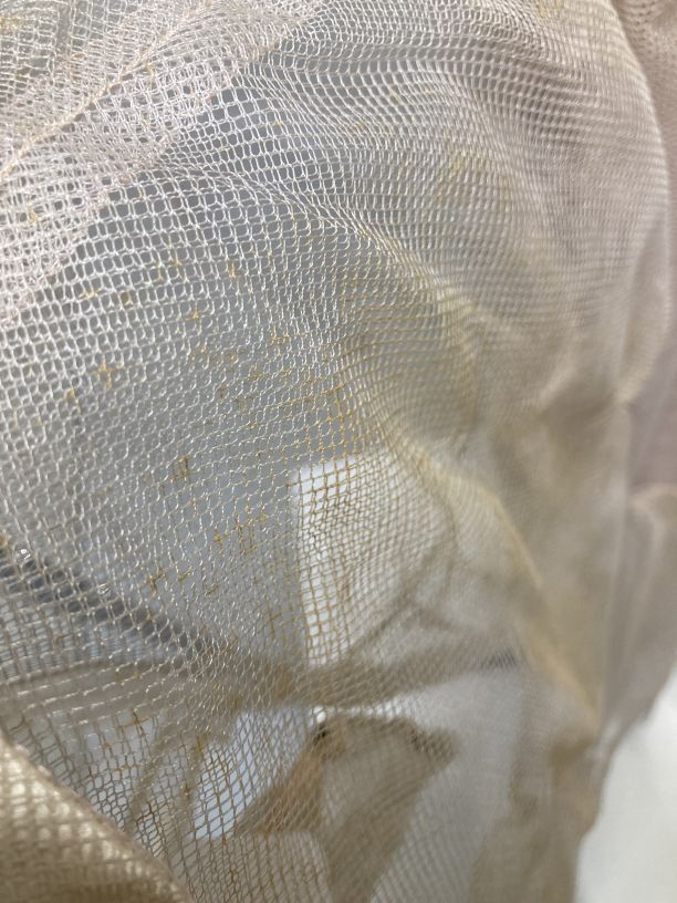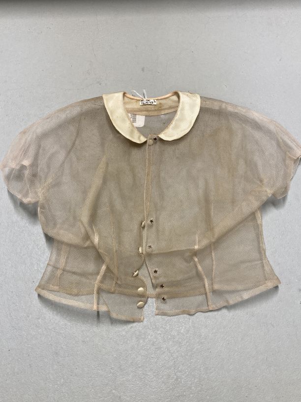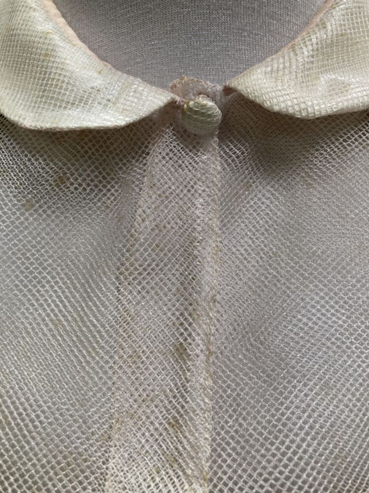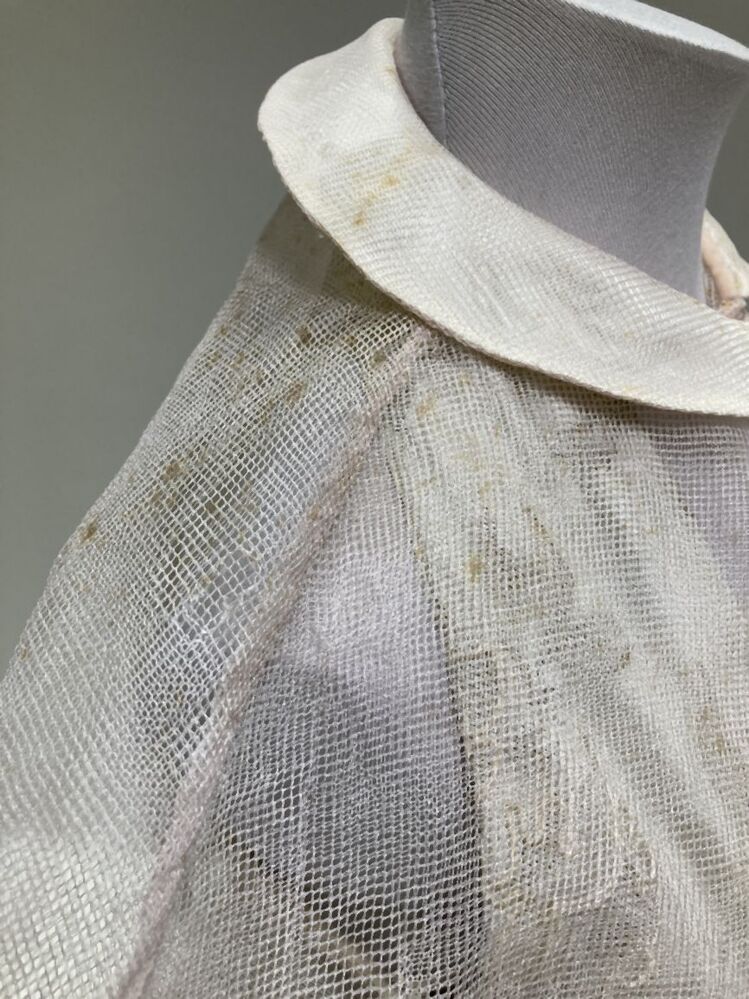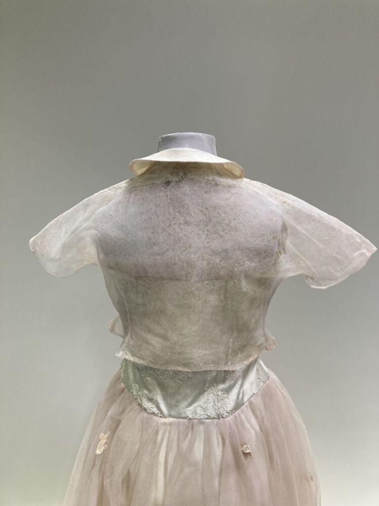 Bolero gemaakt van grove lichtroze tule met platliggend satijnen kraagje en sluiting met zes satijnen knopen, behorende bij trouwjapon met brocaat lijfje, roze nylon tule overrok (A)