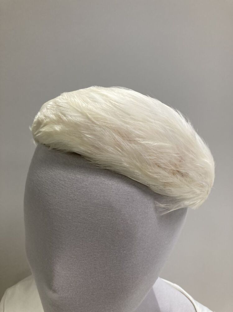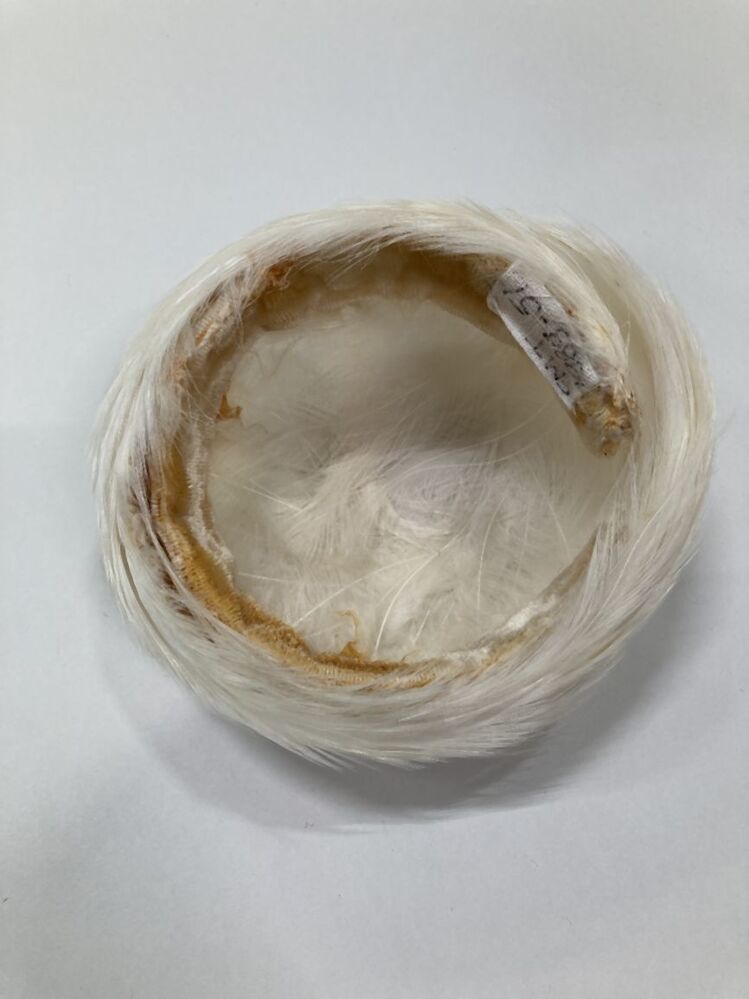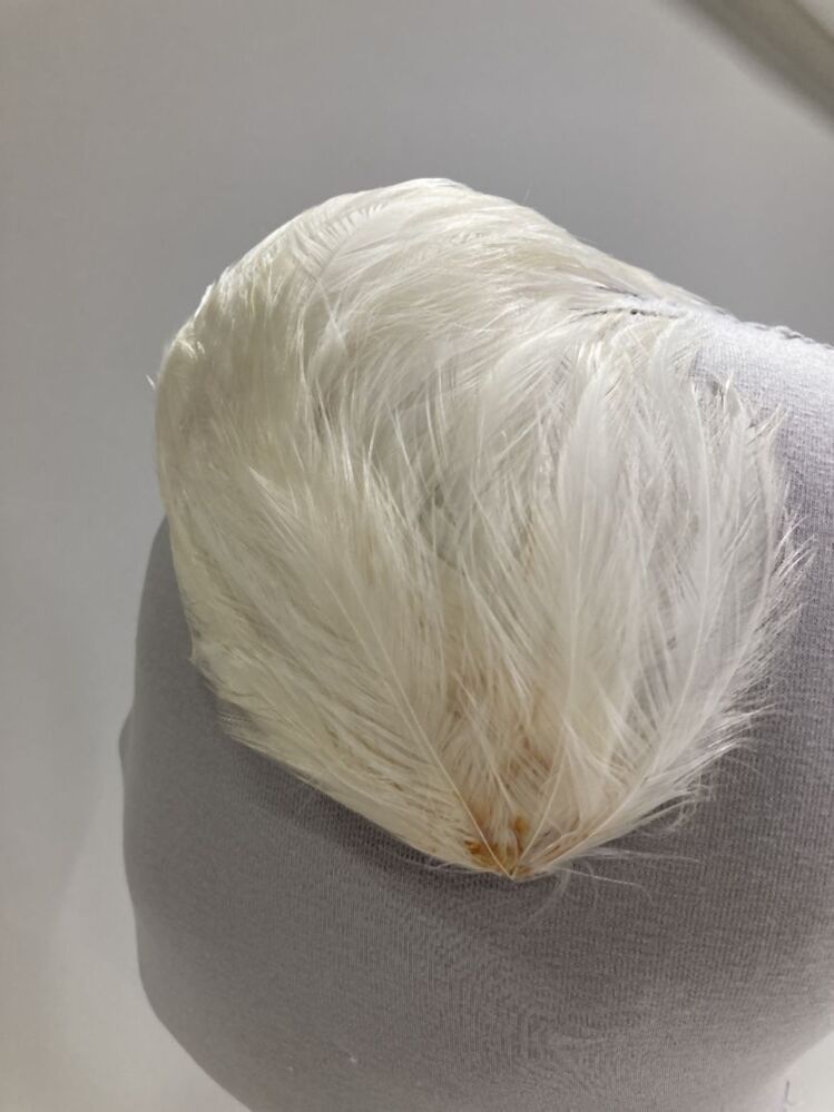 Gebogen trouw-diadeem met witte kalkoenveertjes gevoerd met roze velours